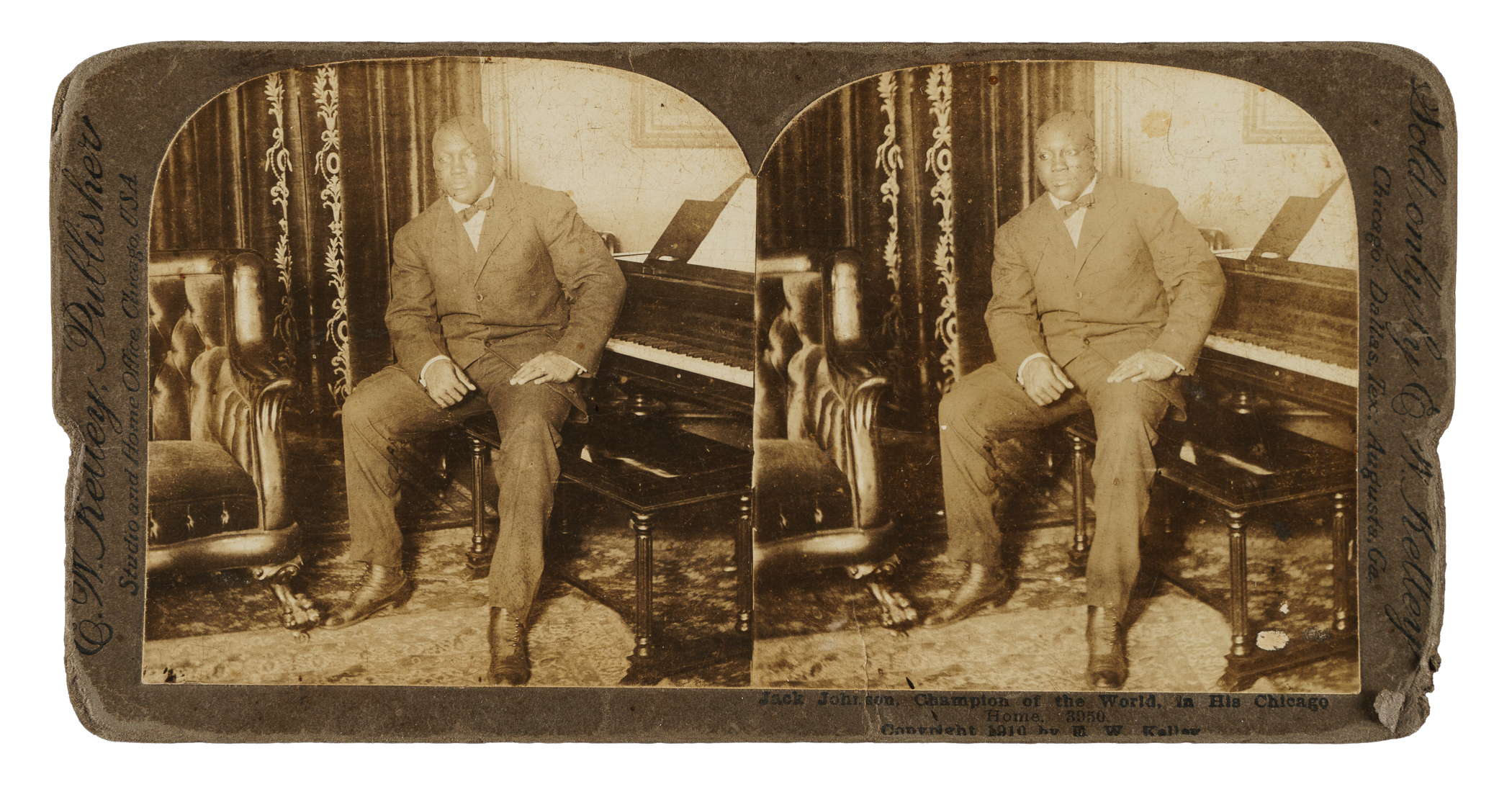 Presented is a stereoview card of Jack Johnson. A stereoview card (standard size is approximately 7 x 3.5 inches) features two identical photos mounted side-by-side that, when viewed through a stereoscope, merge and appear to present a single three-dimensional image. Johnson is captured in formal attire in his Chicago home. The lettering along the bottom border reads "Jack Johnson. Champion of the World, In His Chicago Home. 3950. Copyright 1910 by E.W. Kelly." The card displays heavy corner and edge wear, while there is crazing on the photos. Good condition overall.