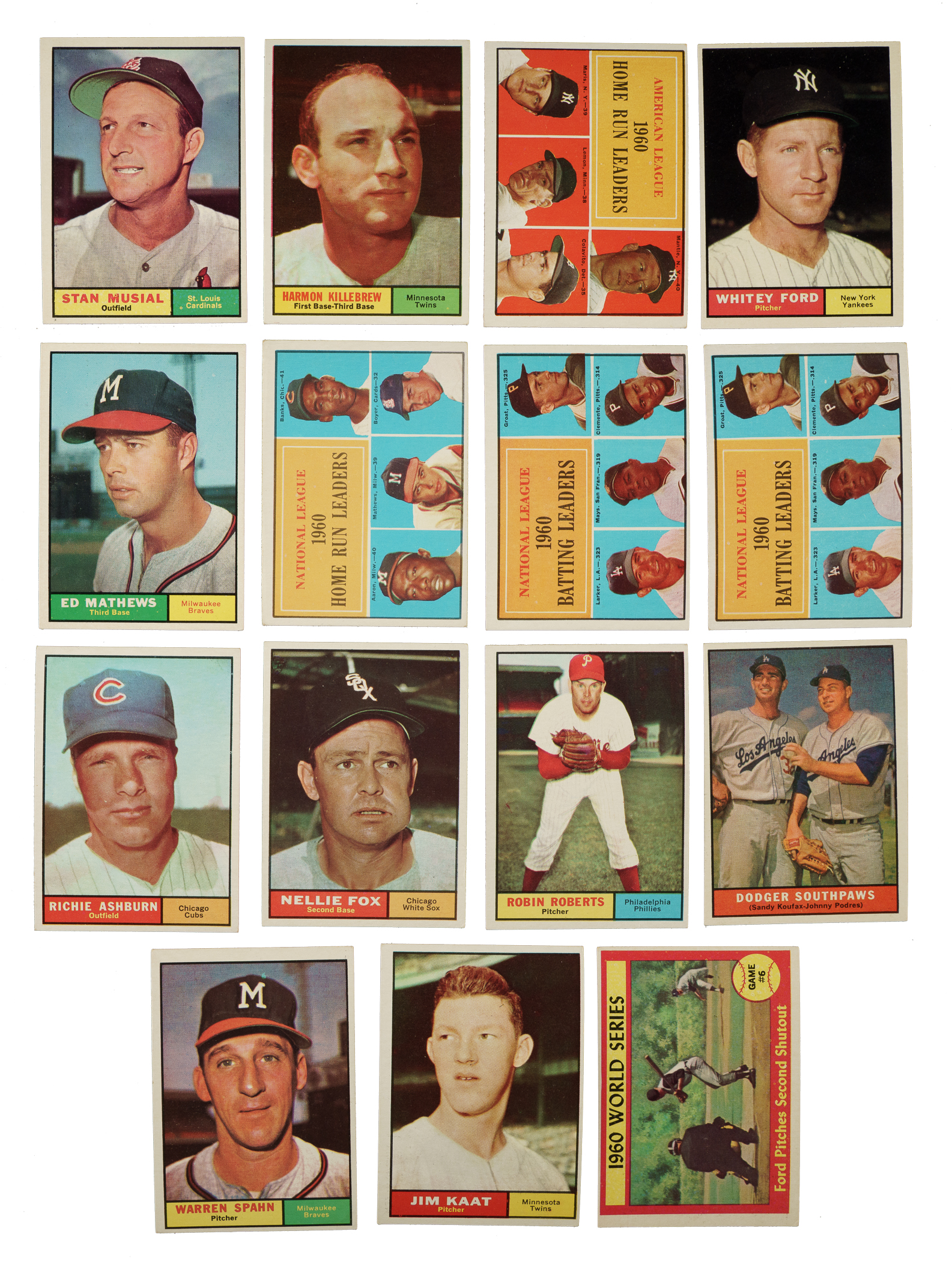 Presented is a collection of 187 (including 176 different) 1961 Topps baseball cards highlighted by eighteen Hall of Famers, including Brooks Robinson, Willie Mays, Stan Musial, and Eddie Mathews. This collection does not include any card numbers higher than #320. Condition is 10% Ex-Mt, 75% Vg-Ex to Ex, and 15% Gd to Vg (including a few lesser). Keys: #2 Maris (Vg-Ex+), 10 B. Robinson (90/10 L/R, otherwise Ex), 20 Roberts (Ex+), 25 Pinson/Bell/F. Robinson, 30 Fox (Ex), two 41 NL Batting Ldrs, 43 NL HR Ldrs, 44 AL HR Ldrs (Ex), 63 Kaat, 80 Killebrew (Ex), 88 Ashburn (Ex+), 120 Mathews (Ex), 150 Mays (15/85 L/R, otherwise Ex-Mt), 160 Ford (Ex), 200 Spahn (Vg+), 207 Koufax/Podres, 260 Drysdale (Vg-Ex), 290 Musial (Ex), and 311 WS Gm. 6 - Ford. A very attractive and consistent mid-grade collection of this classic 1960s Topps issue. Total: 187 cards.