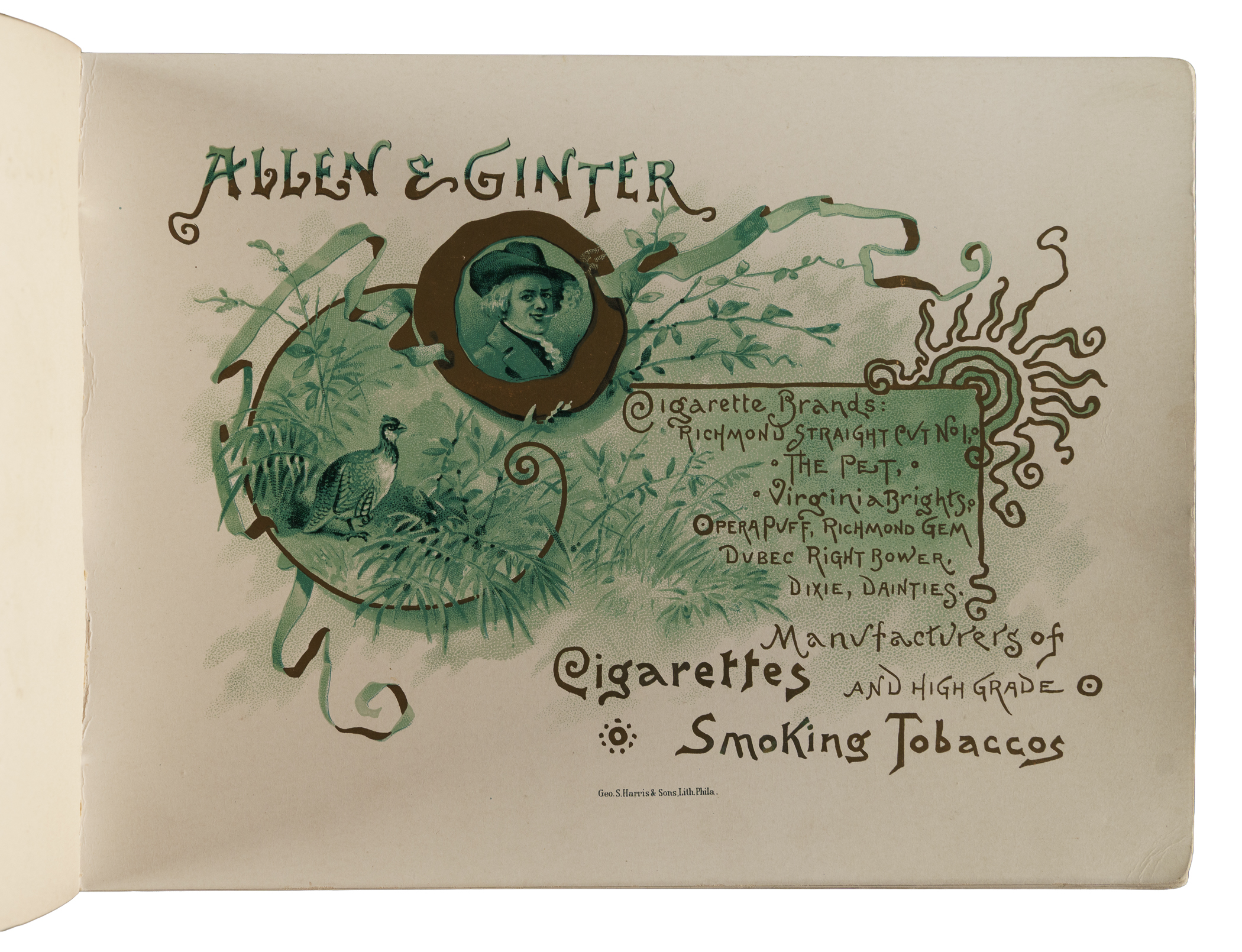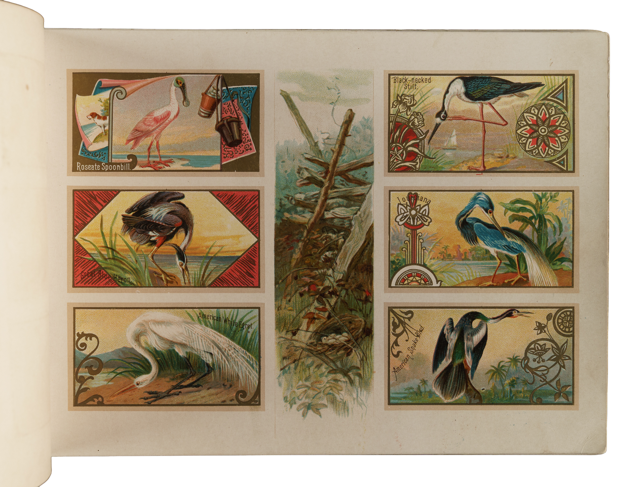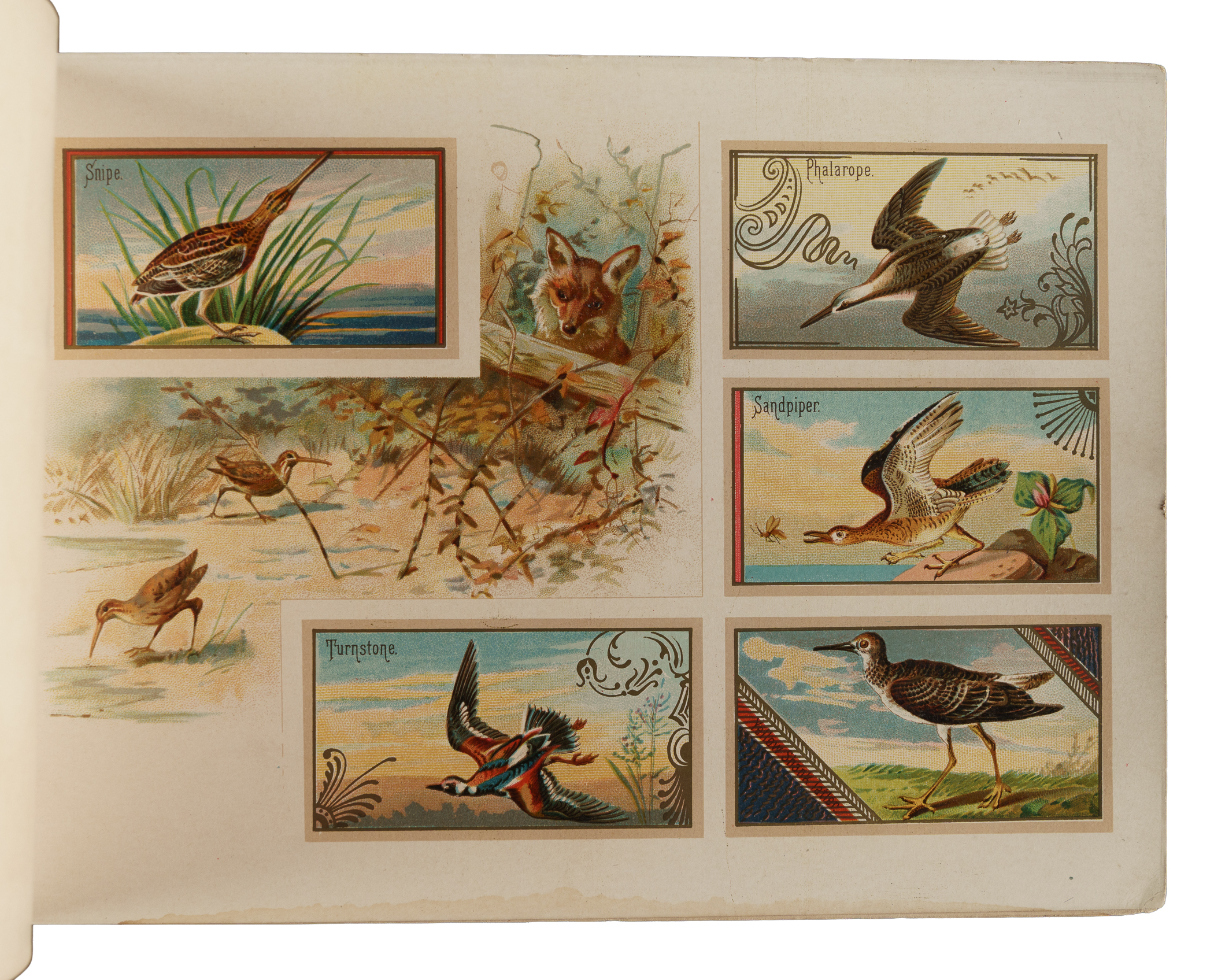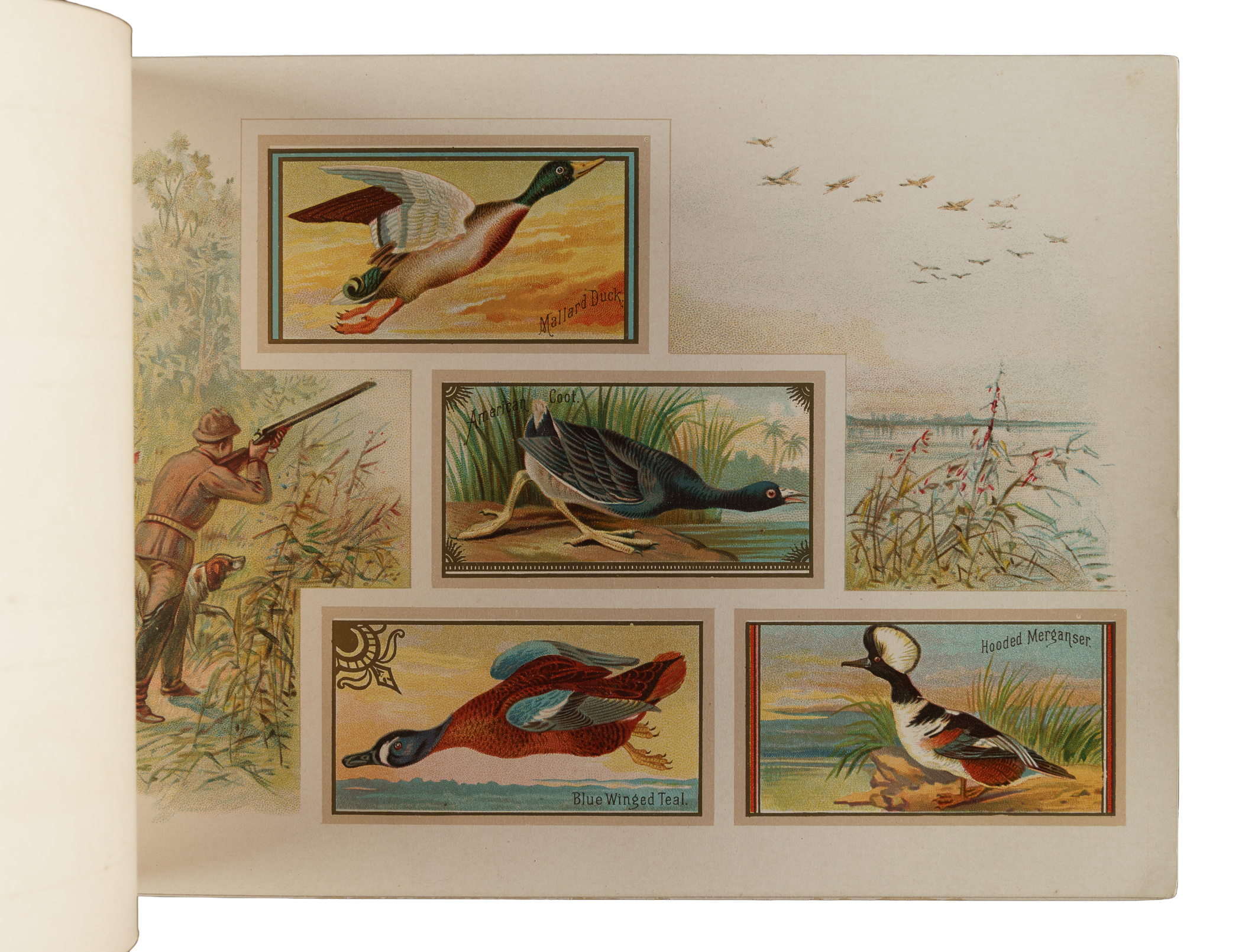 Extremely desirable 1889 Allen & Ginter "Game Birds" premium album featuring all 50 cards from the N2 Allen & Ginter set. This is a very substantial tobacco premium album featuring the entire "Game Birds" set. The tobacco companies spared no expense in producing these gorgeous full-color lithographic premium albums, available only by mail in exchange for coupons packed with tobacco products (in this case, Allen & Ginter). The album displays moderate handling wear, with light creasing along both covers and staining along the back cover. The interior pages are bright and crisp. A very appealing example of this classic, popular, and colorful premium album.