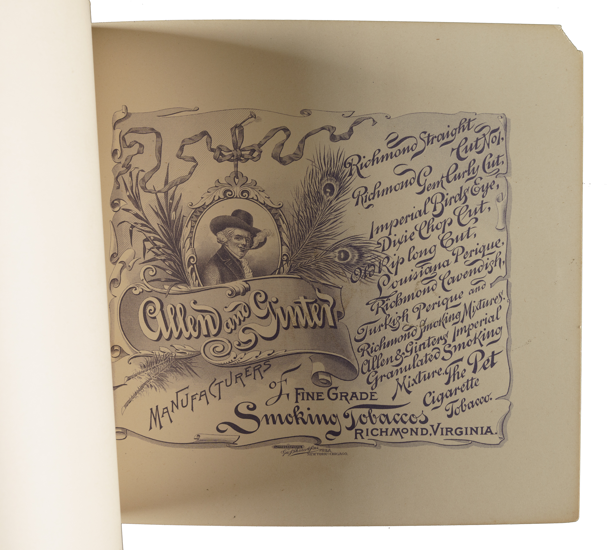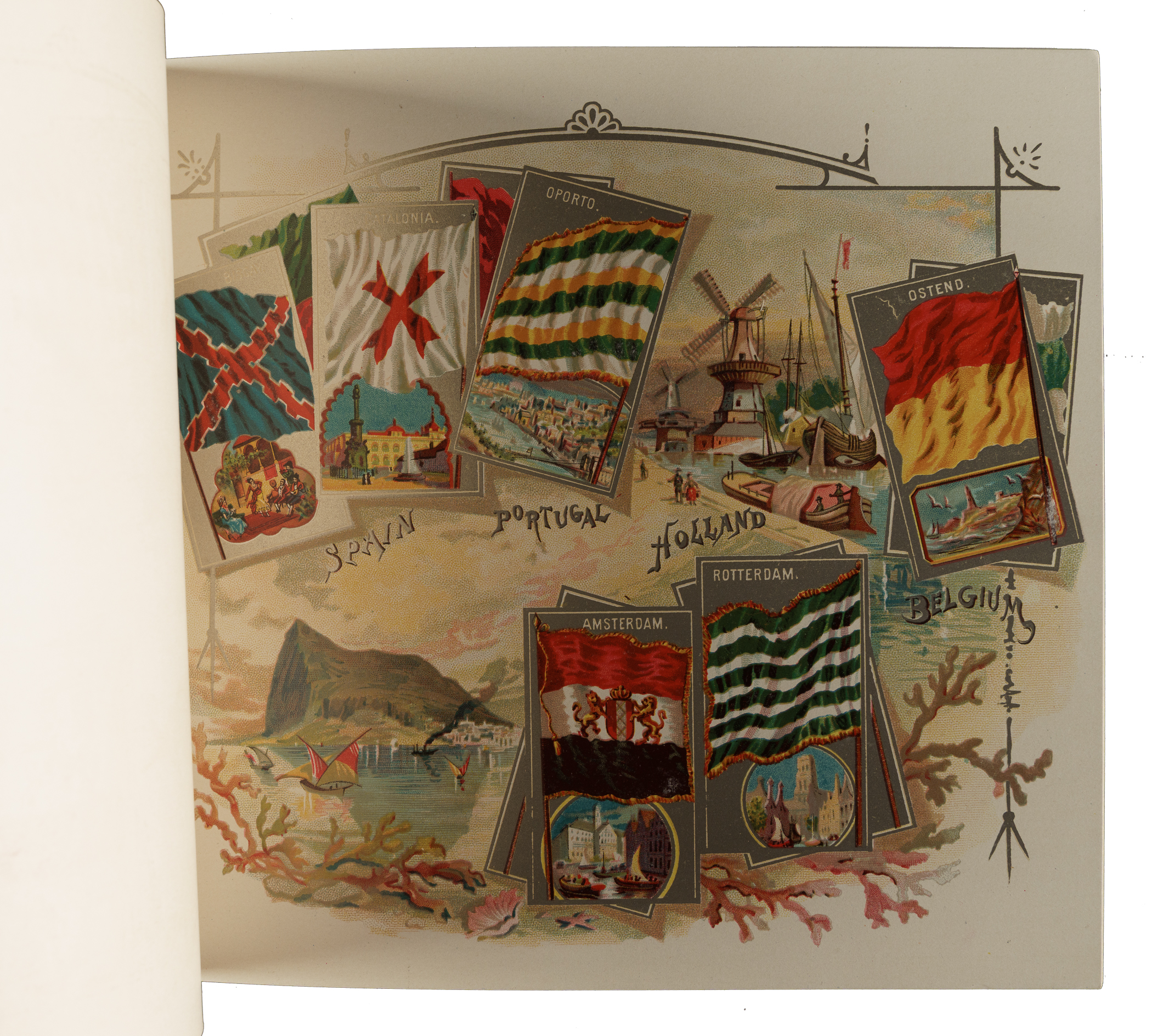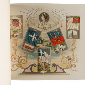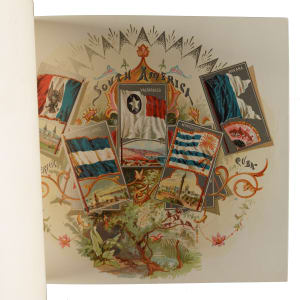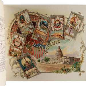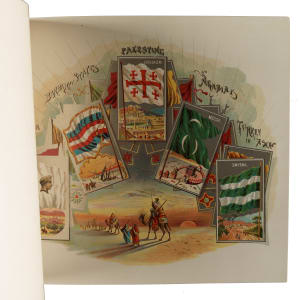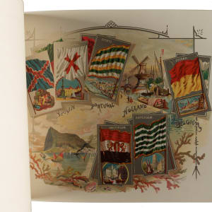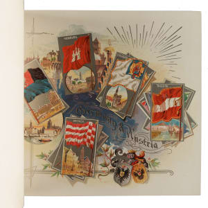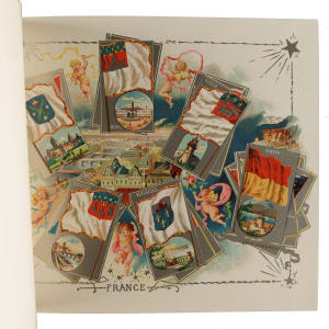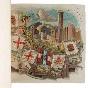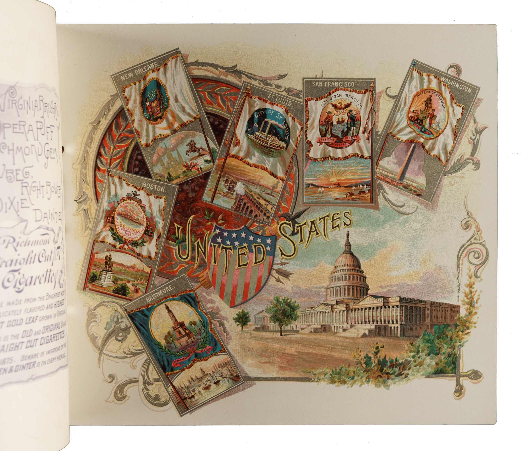 Extremely desirable circa 1888 Allen & Ginter "City Flags" premium album featuring all 50 cards from the N2 Allen & Ginter set. This is a very substantial tobacco premium album featuring the entire "City Flags" set. The tobacco companies spared no expense in producing these gorgeous full-color lithographic premium albums, available only by mail in exchange for coupons packed with tobacco products (in this case, Allen & Ginter). The album displays light handling wear. The last interior page and back cover are missing their bottom-right corner, and the back cover is also missing its top-left corner. The interior pages are bright and crisp. A very appealing example of this classic, popular, and colorful premium album.