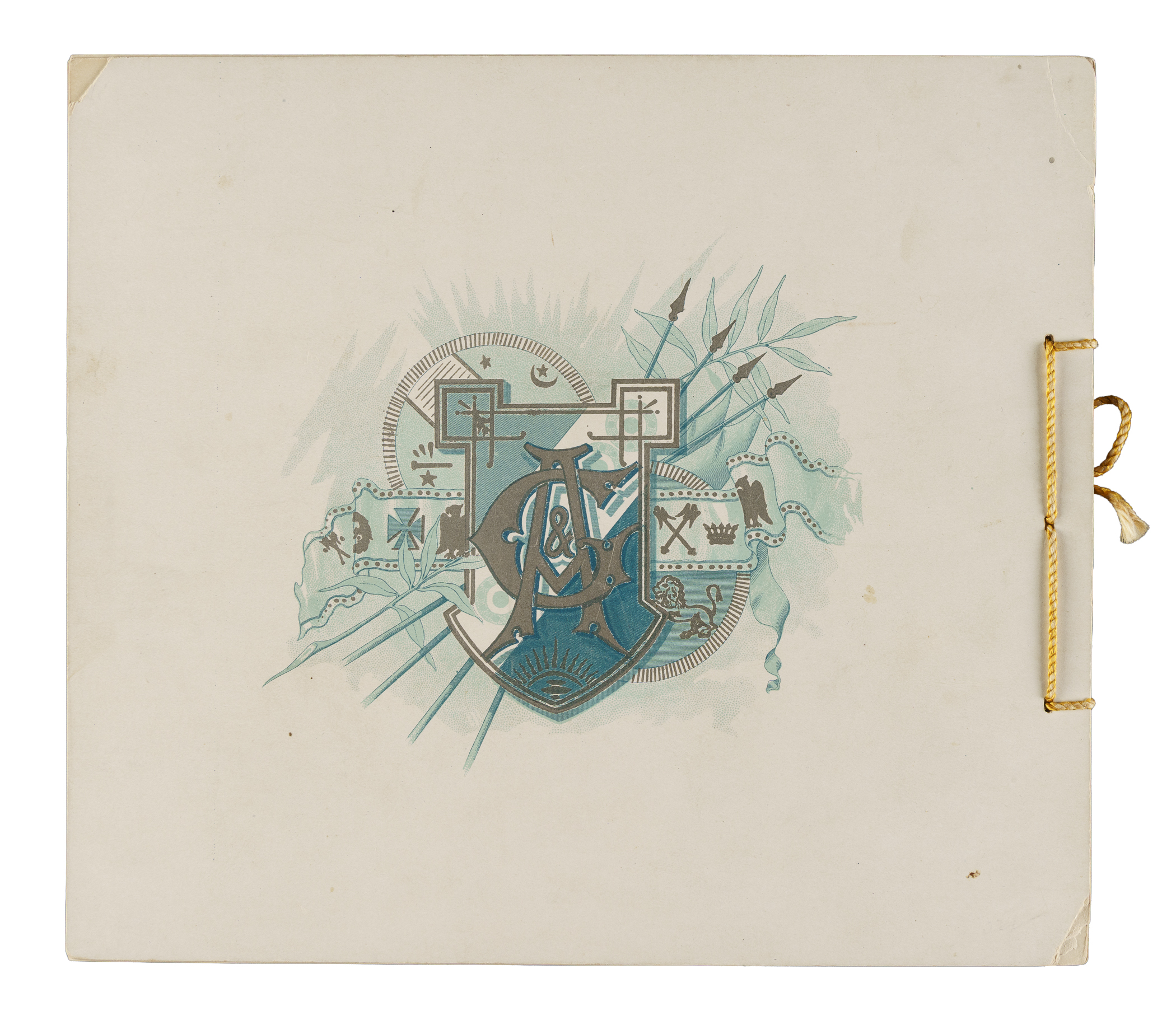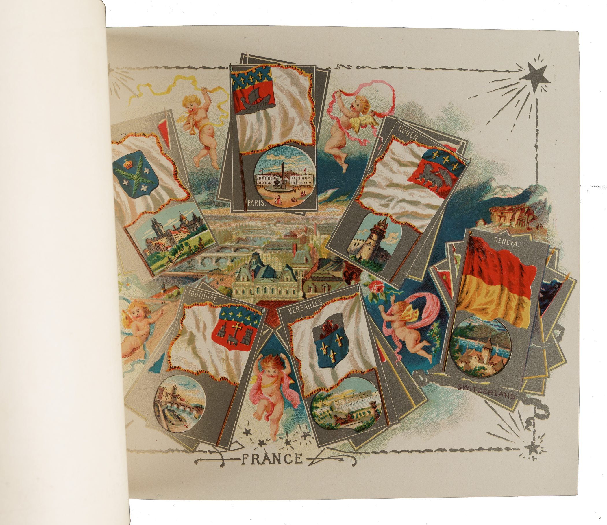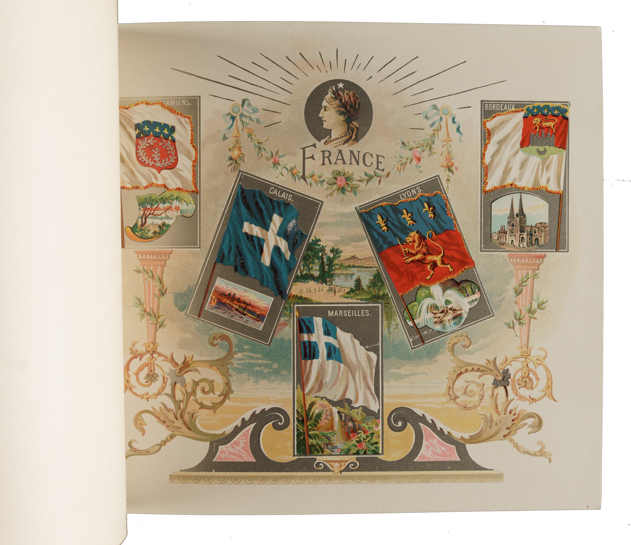 Extremely desirable circa 1888 Allen & Ginter "City Flags" premium album featuring all 50 cards from the N2 Allen & Ginter set. This is a very substantial tobacco premium album featuring the entire "City Flags" set. The tobacco companies spared no expense in producing these gorgeous full-color lithographic premium albums, available only by mail in exchange for coupons packed with tobacco products (in this case, Allen & Ginter). The album displays light handling wear. The last interior page and back cover are missing their bottom-right corner, and the back cover is also missing its top-left corner. The interior pages are bright and crisp. A very appealing example of this classic, popular, and colorful premium album.