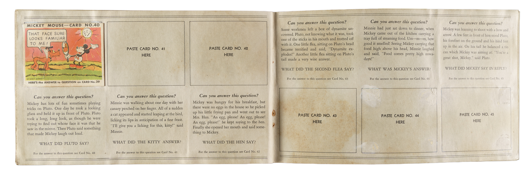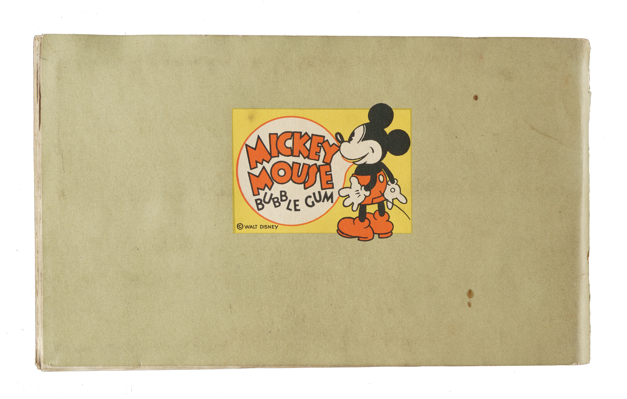 Rarely offered collection of fourteen different 1935 R89 "Mickey Mouse" Bubble Gum cards issued by Gum, Inc. Each card is housed in the original album (affixed with glue) and presents as Vg to Vg-Ex, including one Fair. It should be noted some spots of glue leaked onto the surface of the cards. The grades are without reference to this characteristic. This collection consists of the following #25, 26, 27, 28, 29, 31, 33, 35, 36, 37, 38, 40, 46, and 48. The original "Vol. 1" album in which the cards are mounted is in Good condition. There is ink writing on the front cover (original owner's name), scattered discolorations, rust marks around the staples, and even wear. Mickey Mouse Bubble Gum cards are an iconic 1930s nonsport bubble-gum card set. The brilliant colors, high-quality artwork, and popular subject matter make this set a favorite with collectors. It is worth noting that cards from this set are much scarcer than most collectors realize and far more difficult to find than most baseball cards of the era. This is a relatively affordable yet still attractive group of one of the most popular of all 1930s gum-card sets with tremendous crossover appeal to both card collectors and Mickey Mouse collectors. Total: 14 cards mounted in original album.