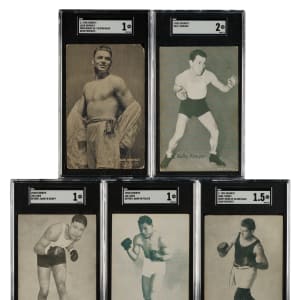 Collection of five 1930s Exhibits boxing cards, featuring boxing Hall of Famers Jack Dempsey and Joe Louis. Each card has been graded and encapsulated by SGC. This collection consists of the following: Dempsey/from knees up, coupon back (POOR 1), Krieger (GOOD 2), Louis/name in script (POOR 1), Louis/name in italics (POOR 1), and Tunney/right hand up (FAIR 1.5). Total: 5 cards.