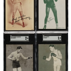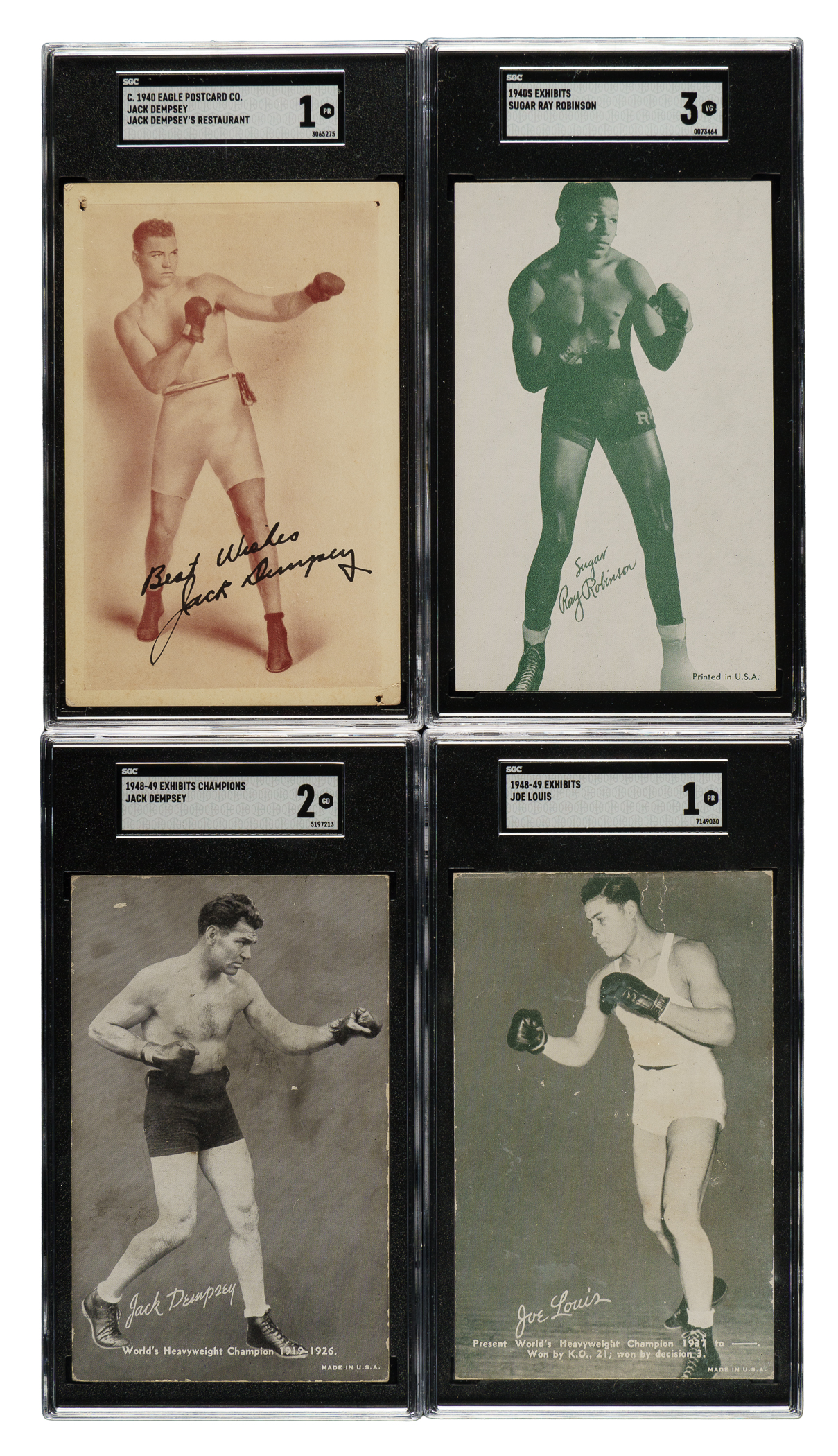 Collection of four 1940s Exhibits boxing cards, featuring boxing Hall of Famers Jack Dempsey, Joe Louis, and Ray Robinson. Each card has been graded and encapsulated by SGC. This collection consists of the following: 1) Circa 1940 Eagle Postcard (1 card): Dempsey (POOR 1). 2) 1940s Exhibits (1 card): Robinson (VG 3). 1948-1949 W469 Exhibits "Sports Champions" (2 cards): Dempsey (GOOD 2) and Louis (POOR 1). Total: 4 cards.
