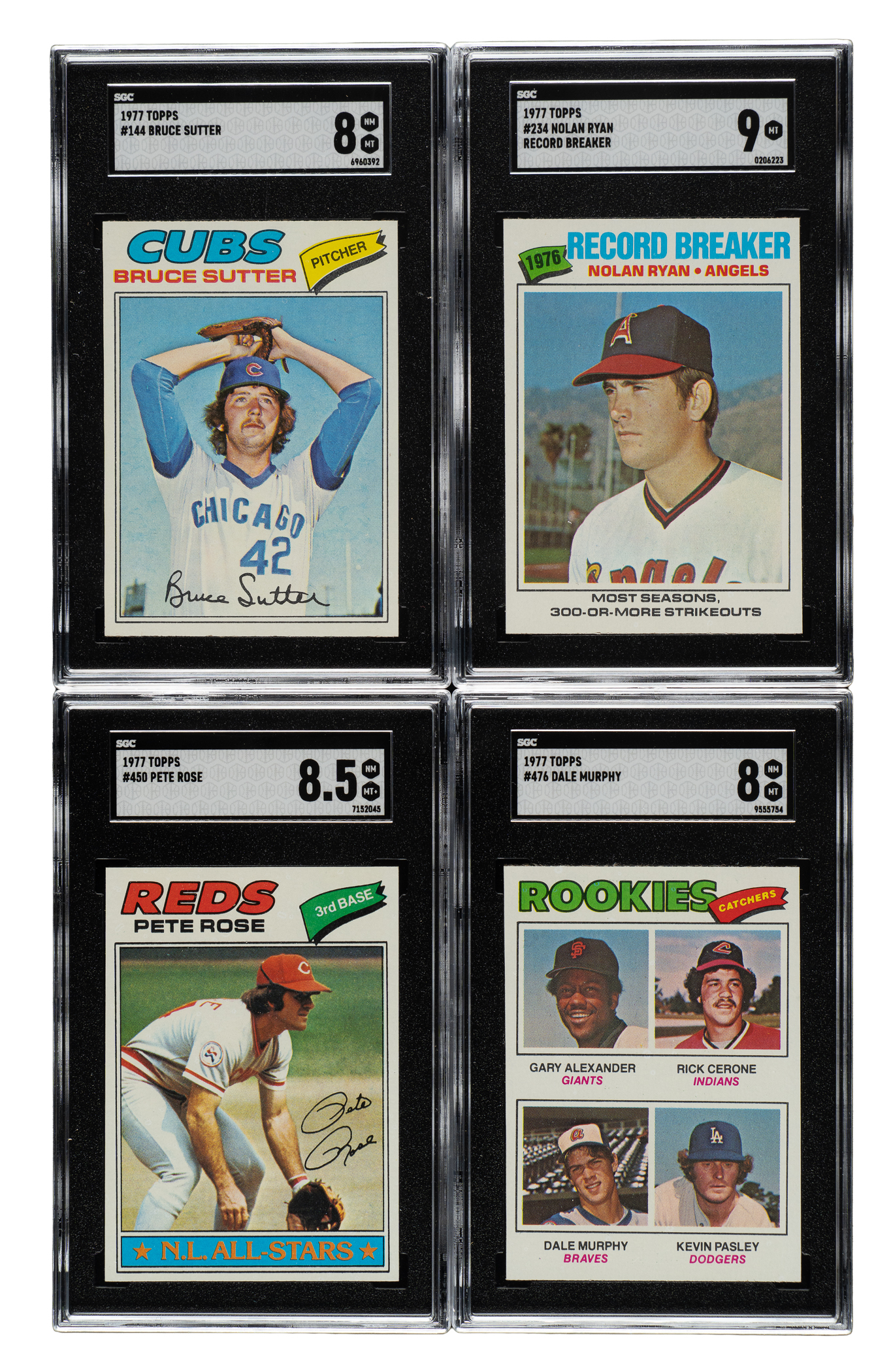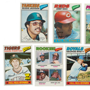 The rookie cards of Andre Dawson, Bruce Sutter, and Dale Murphy highlight the 1977 Topps issue, one of the very popular sets of the 1970s. Condition is 65% Nr/Mt to Nr/Mt-Mt (including some Mint) and 35% Ex to Ex-Mt (including a few slightly lesser). We have selected four cards for grading and encapsulation by SGC. Keys: #10 Jackson (Nr/Mt), 70 Bench (Ex), 140 Schmidt (90/10 T/B, otherwise Ex+), 144 Sutter RC (NM/MT 8), 234 Ryan RB (MINT 9), 265 Fidrych RC (Vg-Ex), 450 Rose (NM/MT+ 8.5), 473 Dawson RC (Ex-Mt due to tilt to the picture), 476 Murphy RC (NM/MT 8), 580 Brett (Ex+), and 650 Ryan (Nr/Mt+). This is an outstanding high-grade set loaded with Hall of Famers and stars from the 1970s. Total: 660 cards.