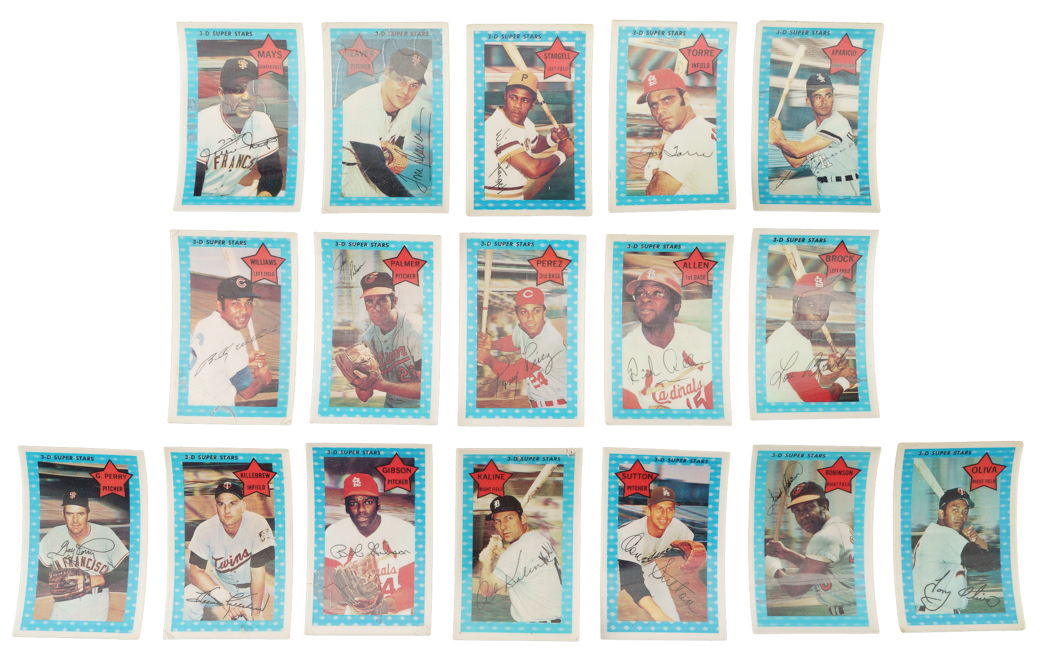 Presented is an attractive mixed-grade complete set (75 cards) of 1971 Kellogg's 3-D baseball cards. Cards of Tom Seaver, Roberto Clemente, Willie Mays, Pete Rose, and many other stars and Hall of Fame members highlight the set. The 1971 set is by far the key year for a Kellogg's set run, as this was the only year that collectors were not offered the opportunity to order a complete set directly from Kellogg's. The only way to have assembled a 1971 Kellogg's set was to buy countless boxes of cereal, which included only one card per box. Condition is 28% Nr/Mt to Nr/Mt-Mt, 18% Ex to Ex-Mt, 28% Vg to Vg-Ex (mostly due to small surface cracks), and 26% lesser (mostly due to heavy surface cracking). Keys: #2 Seaver (Fr), 5 Clemente (Vg-Ex+), 10 Mays (Fr), 50 Banks (Ex-Mt), and 65 Rose (Vg). Total: 75 cards.