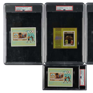 Collection of four 1971 and 1972 Olympic Boxing Stamp Souvenir Sheet cards, featuring boxing Hall of Famers Cassius Clay and Joe Frazier. Each card has been graded and encapsulated by PSA. This collection consists of the following: 1) 1971 Manama Stamp Great Olympic Champions Boxing Sovenir Sheet (2 cards): Two Ali/Frazier (NM-MT 8 and EX-MT 6). 2) 1972 Ajman Olympic Boxing Stamp Souvenir Sheet (2 cards): Two Clay (EX-MT 6 and VG+ 3.5). Total: 4 cards. The size/weight of this item requires that there will be an additional shipping charge for this lot.
