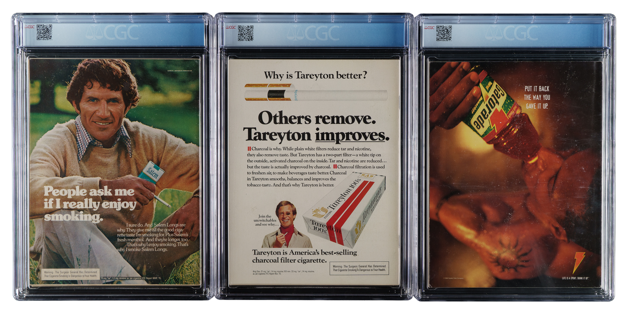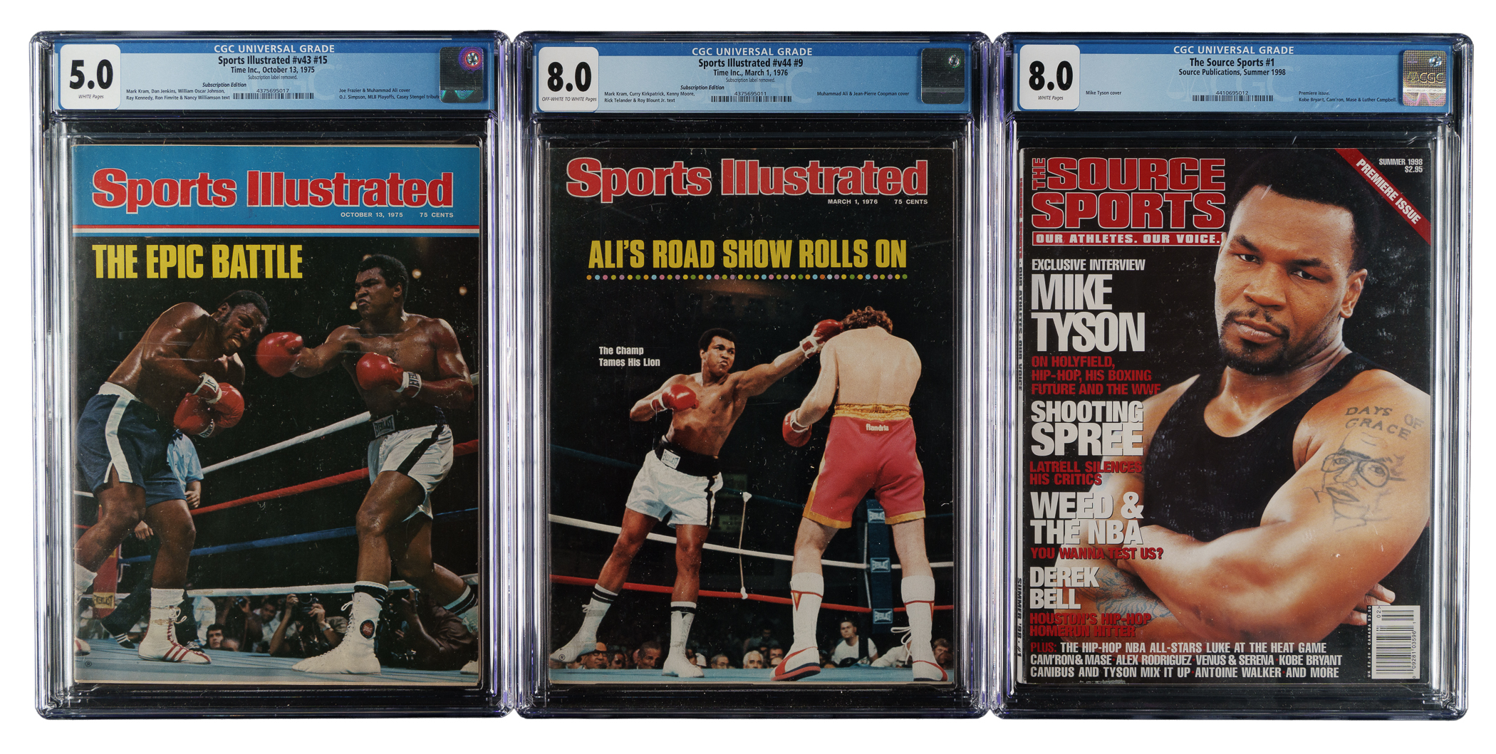 Trio of 1975 to 1998 Sports Illustrated and The Source Sports boxing magazines, featuring boxing Hall of Famers Muhammad Ali, Joe Frazier and Mike Tyson. Each magazine is graded and encapsulated by CGC. This trio consists of the following: 1) 1975 Sports Illustrated with Muhammad Ali and Joe Frazier (5.0). 2) 1976 Sports Illustrated with Muhammad Ali (8.0). 3) 1998 The Source Sports with Mike Tyson (8.0). Total: 3 magazines. The size/weight of this item requires that there will be an additional shipping charge for this lot.