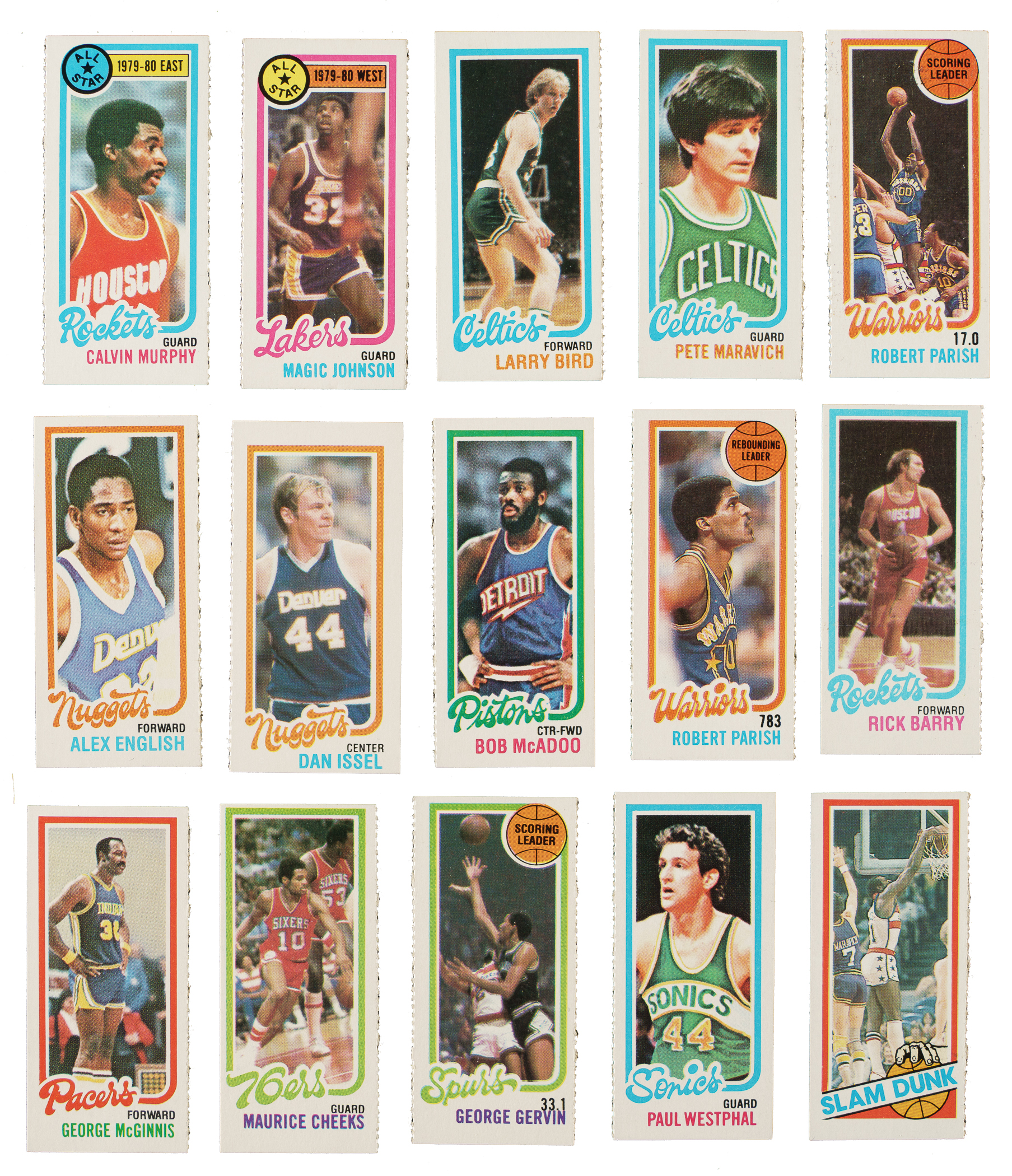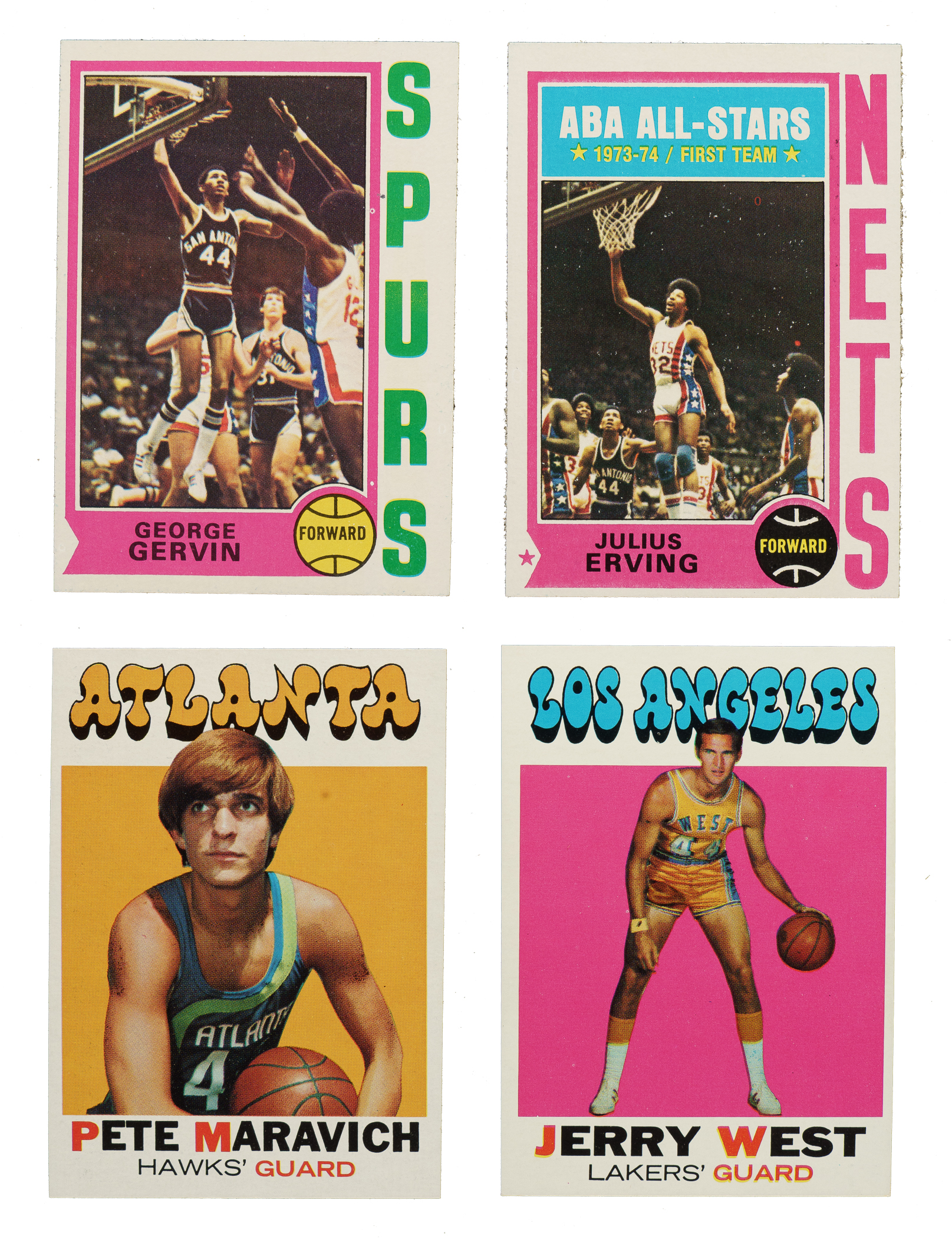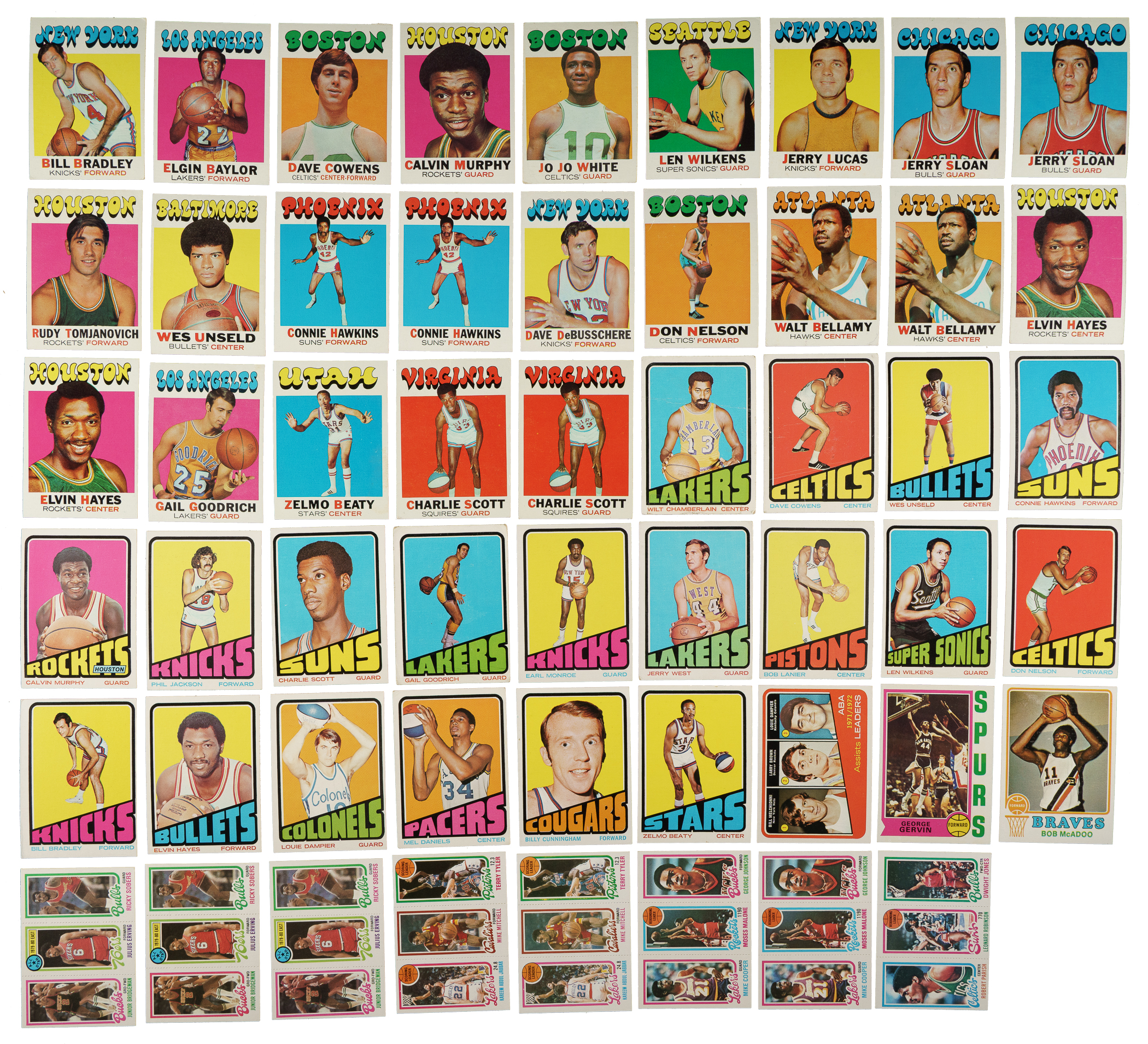 Very attractive and mostly mid- to high-grade collection of 292 Topps basketball cards spanning the years 1971 to 1981. The collection is highlighted by scores of Hall of Famers, including Pete Maravich, Wilt Chamberlain, Larry Bird, George Gervin, and Julius Erving. This collection consists of the following: 1) 1971-1972 Topps (64 cards): Condition ranges from Vg-Ex to Nr/Mt (averaging Ex/Ex-Mt), with a couple Nr/Mt-Mt and 10% slightly lesser. Includes the following: #2 Bradley (Vg), 3, 5, 9, 10 Baylor (Ex), 13, 15, 19, 24, 25, 26, 33, two 39, 45, 47 Cowens RC (Ex), 50 West (Ex-Mt), 51, 54, 55 Maravich (Nr/Mt), 56, 58 Murphy (Ex-Mt), 69 White, 75, 80 Wilkens (Vg-Ex), 81 Lucas, 85, two 87 Sloan, 90, 91 Tomjanovich RC (Ex), 92, 94, 95 Unseld (Ex+), 102, 104, two 105 Hawkins, 107 DeBusschere, 114 Nelson, two 116 Bellamy, 119, two 120 Hayes (Ex-Mt and Vg), 121 Goodrich (Nr/Mt+), 122, 123, 126, 128, 134, 145 Checklist (Ex), 165 Beaty RC (Ex), 169, 171, 184, 185, 188, two 190 Scott, 196, 206, 212, and 219. 2) 1972-1973 Topps (37 cards): Condition is 62% ranging from Vg-Ex to Nr/Mt (averaging Ex/Ex-Mt) and 32% ranging from Pr to Vg (averaging Gd). Includes the following: #1 Chamberlain (Pr), 7 Cowens (Gd), 20 Wicks RC, 21 Unseld (Ex), 30 Hawkins, 31 Murphy, 32 Jackson RC (Vg-Ex), 47 Scott, 50 Goodrich (Gd), 73 Monroe (Ex-Mt), 75 West (Vg), 76, 80 Lanier (Gd+), 81 Wilkens (Ex-Mt), 89, 90, 92 Nelson, 104, 113, 122 Bradley (Vg), 123, 137, 145, 150 Hayes (Ex-Mt), 178, 182, 194, 196, 198 Dampier (80/20 L/R, otherwise Ex-Mt+), 200 Daniels, 207, 215 Cunningham (Ex-Mt), 220 Beatty, 221, 237, 239, and 264 Brown/Dampier Assists Ldrs. 3) 1973-1974 Topps (4 cards): #6 (Ex-Mt+), 44 (Vg-Ex), 106 (Ex), and 135 McAdoo RC (Nr/Mt). 4) 1974-1975 Topps (3 cards): Two #196 Gervin RC (Nr/Mt and Ex-Mt) and 200 Erving AS (Ex due to centering). 5) 1980-1981 Topps (131 cards, including 71 different): Condition ranges from Vg-Ex to Nr/Mt-Mt (averaging Ex/Ex-Mt), with a few slightly lesser. Keys: Two #43 Abdul-Jabbar Ldr, two 45 Cooper RC/Malone Ldr (Ex-Mt and Vg-Ex+), 133 Cooper RC (Ex-Mt due to centering), three 137 Erving AS, and 165 Bird Ldr (Nr/Mt). Includes dozens of additional cards with at least one Hall of Famer. 6) 1980-1981 Topps Singles (53 cards, detached at the perforations): Condition ranges from Ex to Nr/Mt-Mt (averaging Ex-Mt), with a few lesser. Keys: #18 Johnson AS (Nr/Mt+), 34 Bird RC (Ex-Mt), 38 Maravich (Nr/Mt), 75 English, 76 Issel, 105 Barry, 178 Cheeks RC (Ex due to centering), and 204 Gervin Ldr. Total: 292 cards. The size/weight of this item requires that there will be an additional shipping charge for this lot.