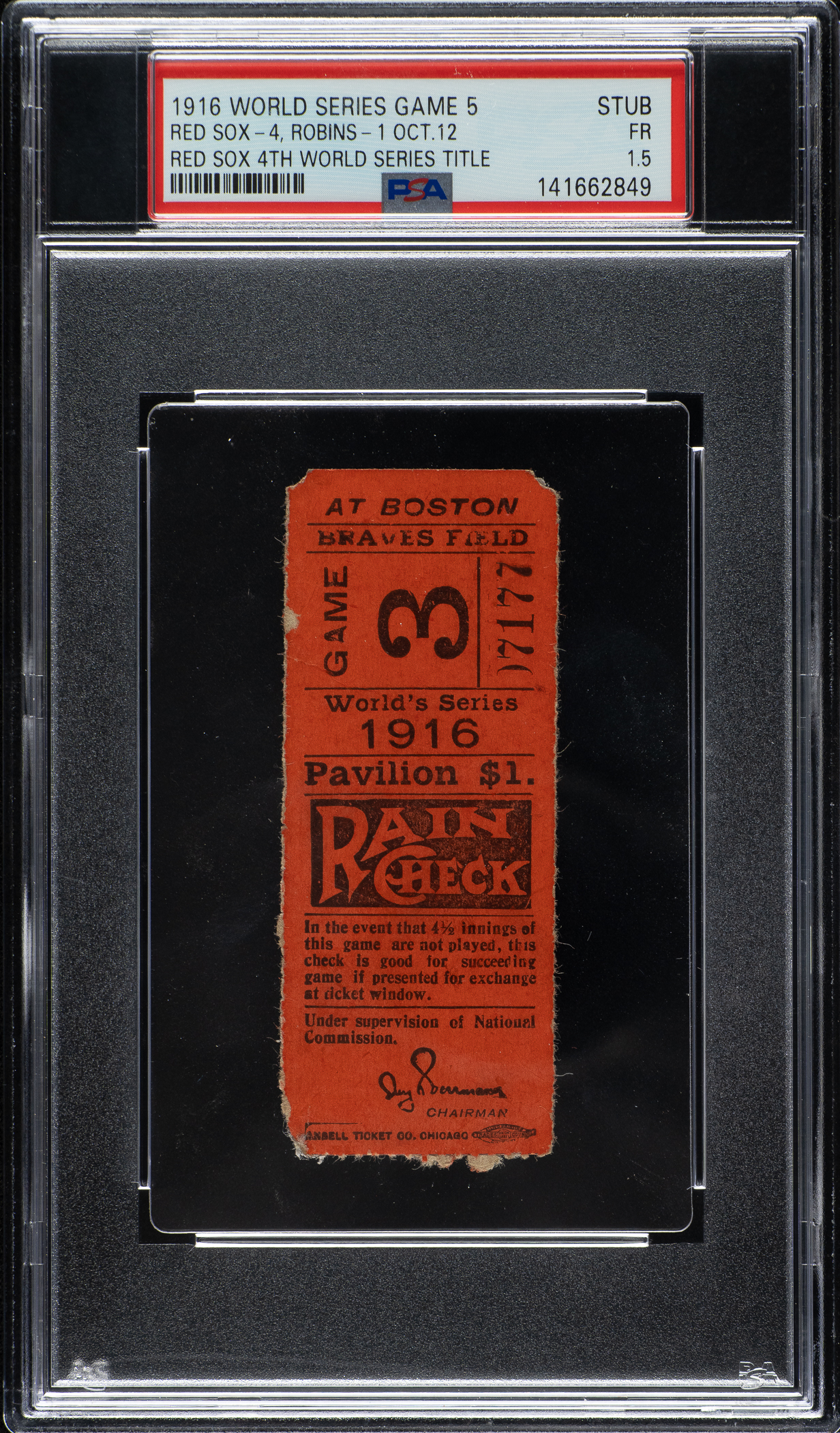 Ticket stub issued for Game 5 of the 1916 World Series between the Brooklyn Robins (Dodgers) and Boston Red Sox held at Braves Field on October 12. Graded FAIR 1.5 by PSA. This is only the second 1916 World Series Game 5 ticket stub we have offered in the past 22 years and one of only seven graded by PSA. The ticket reads "Game 3," but the number denotes the third game in Boston, not the third game of the Series. Boston won the clinching Game 5 by a score of 4-1 over Brooklyn in the World Series. The championship was Boston's second consecutive during a period when the club won four Series in a span of seven years (1912-1918). The ticket stub (1-3/8 x 3-3/8 inches) displays a few light creases and paper loss on the reverse from having once been mounted in an album.