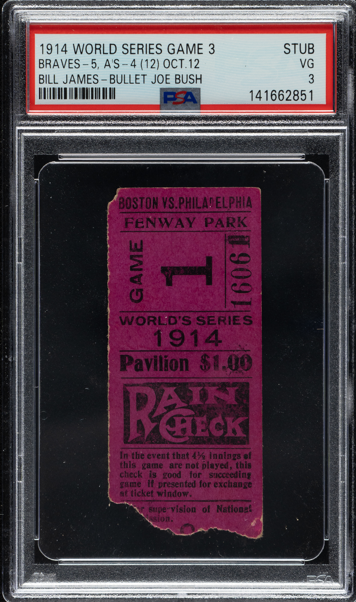 Ticket stub issued for Game 3 of the 1914 World Series between the Boston "Miracle" Braves and Philadelphia Athletics, held at Fenway Park in Boston on October 12th. Graded VG 3 by PSA. This is one of only two 1914 World Series Game 3 ticket stubs graded at this level by PSA with none higher. This ticket commemorates one of the most improbable World Championships in baseball history. On July 18, 1914, the Boston Braves were in last place and trailed the first place Giants by eleven games. Miraculously, the team then went on a remarkable winning streak that had them post a record of 60-16 to close out the season and capture the pennant. That incredible feat, together with their subsequent victory over the A's in the World Series, earned the club the apt sobriquet “The Miracle Braves." The ticket stub (1-3/8 x 3) displays a chipped upper-left corner and an irregular tear along the bottom edge. An outstanding example of this scarce World Series ticket stub.
