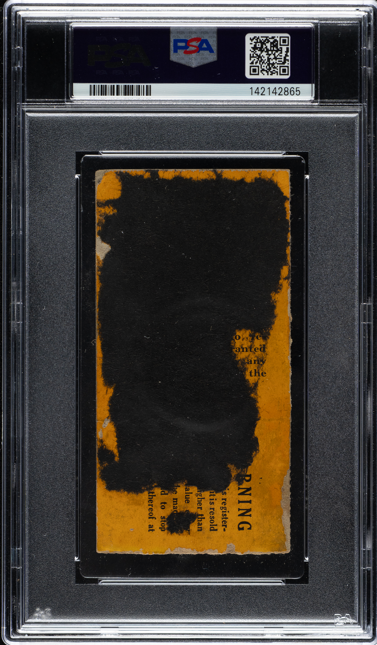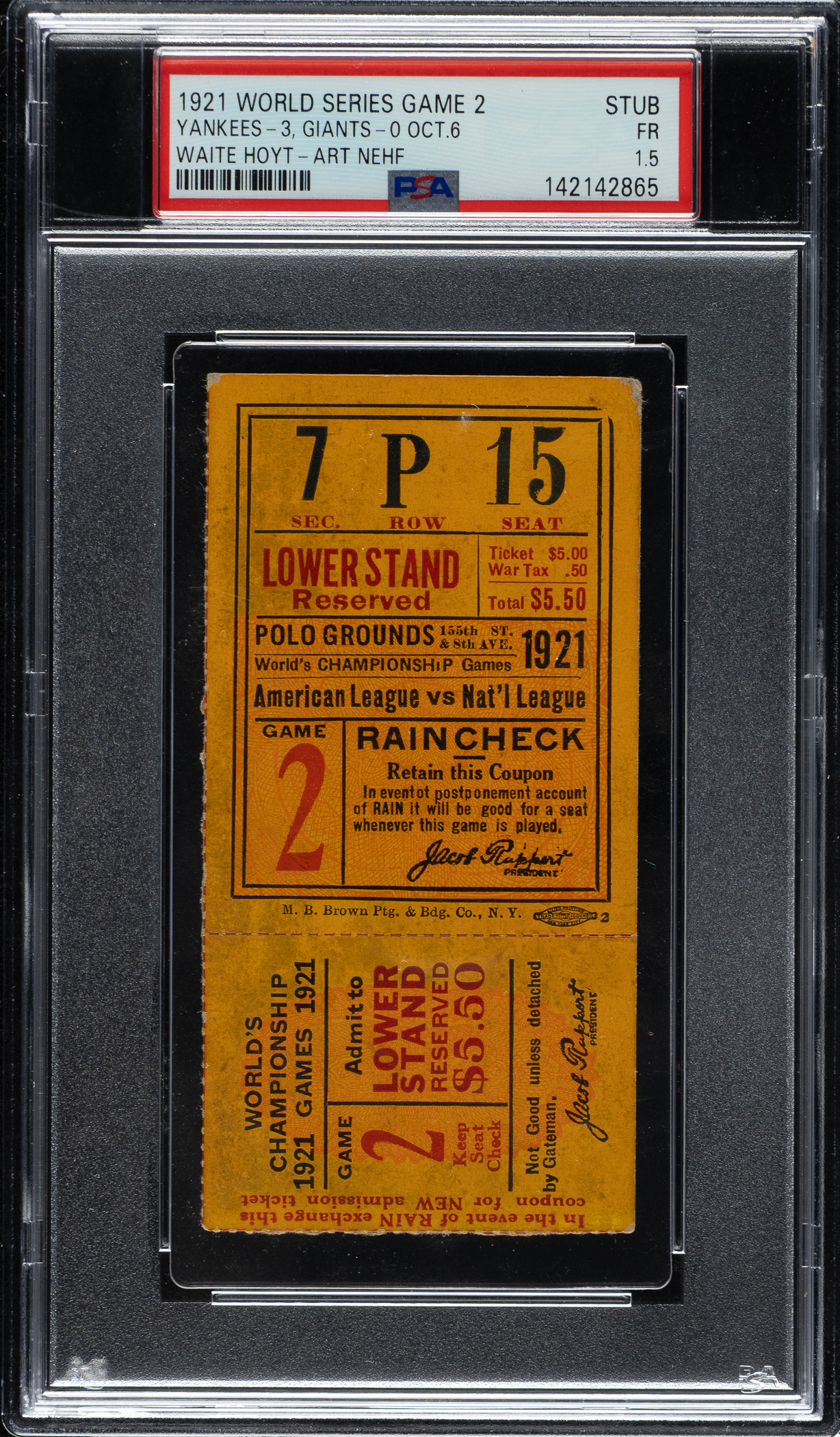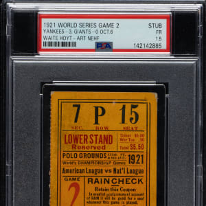 Ticket stub issued for Game 2 of the 1921 World Series between the New York Giants and New York Yankees, held on October 6th at the Polo Grounds. Graded FAIR 1.5 PSA. The Yankees defeated the Giants 3-0 in Game 2, which was highlighted by Babe Ruth's two stolen bases. The Giants defeated the Yankees in eight games (the Series was best of nine in 1921). 1921 marked the first World Series in New York Yankees franchise history, making this a historically important ticket. The ticket stub (2-1/8 x 4-1/4 inches) displays back damage.