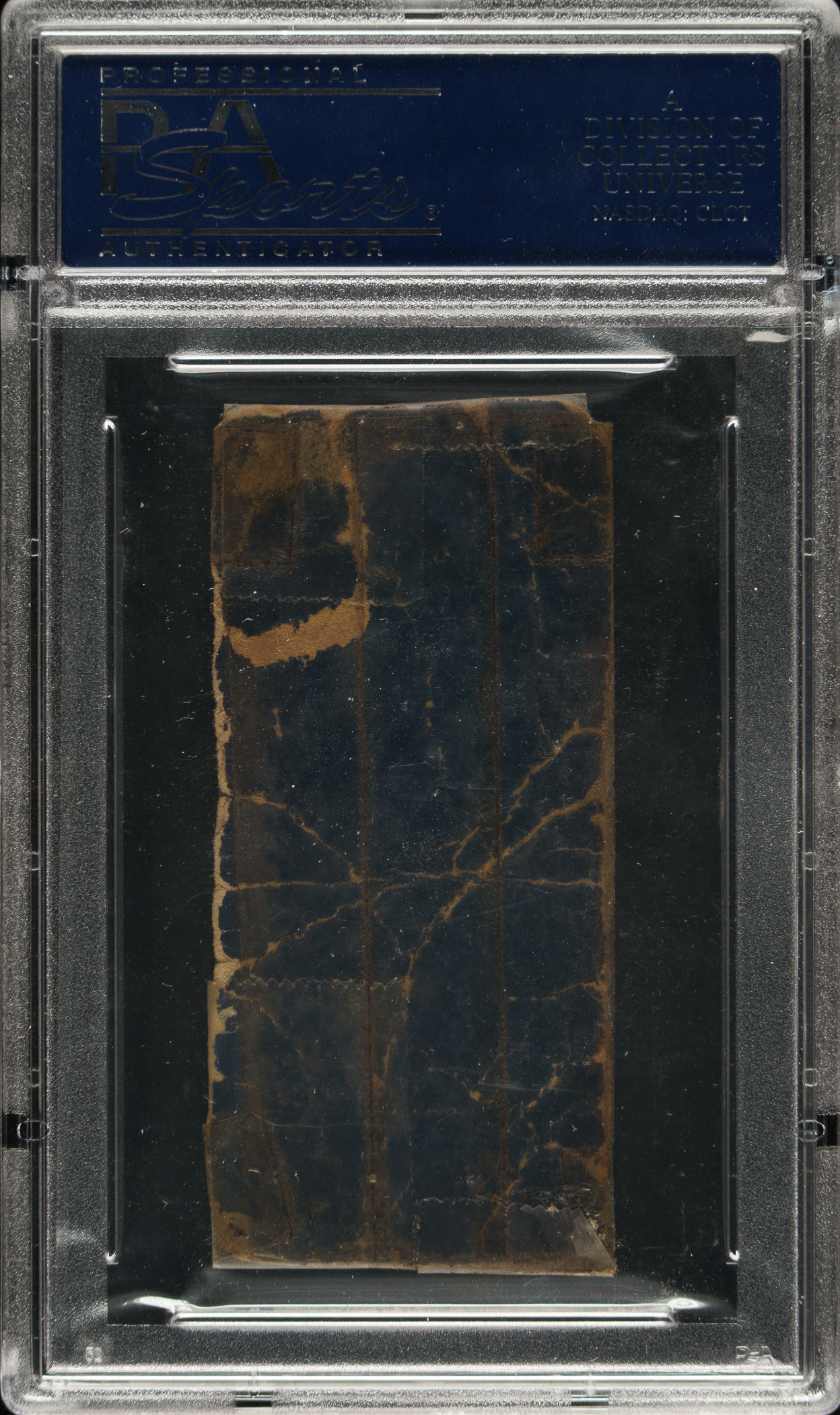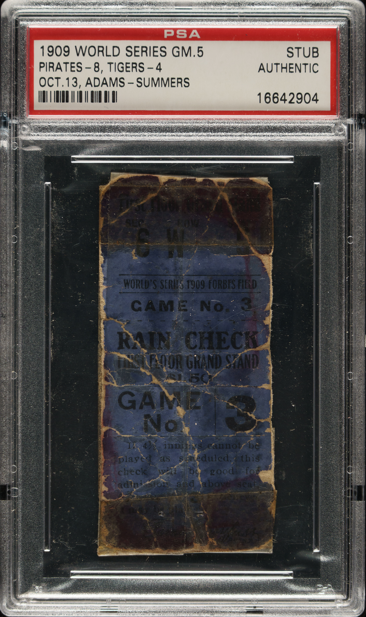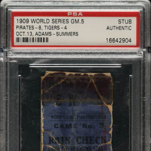 Rare ticket stub from Game 5 of the 1909 World Series between the Pittsburgh Pirates and Detroit Tigers, held at the newly built Forbes Field in Pittsburgh on October 13. PSA has encapsulated the ticket and certified it as “Authentic.” This is one of only two 1909 World Series Game 5 ticket stubs authenticated by PSA. The Pirates' Babe Adams pitched a complete game with eight strikeouts and defeated the Tigers by a score of 8-4 in Game 5. The Pirates eventually won the Series in seven games. The 1909 World Series marked the only time the two greatest players of the dead-ball era, Ty Cobb and Honus Wagner, squared off against each other on the diamond, adding to the historical significance of this extremely early World Series ticket stub. The ticket (1.5 x 3.25 inches) displays heavy creasing and tape repairs throughout.