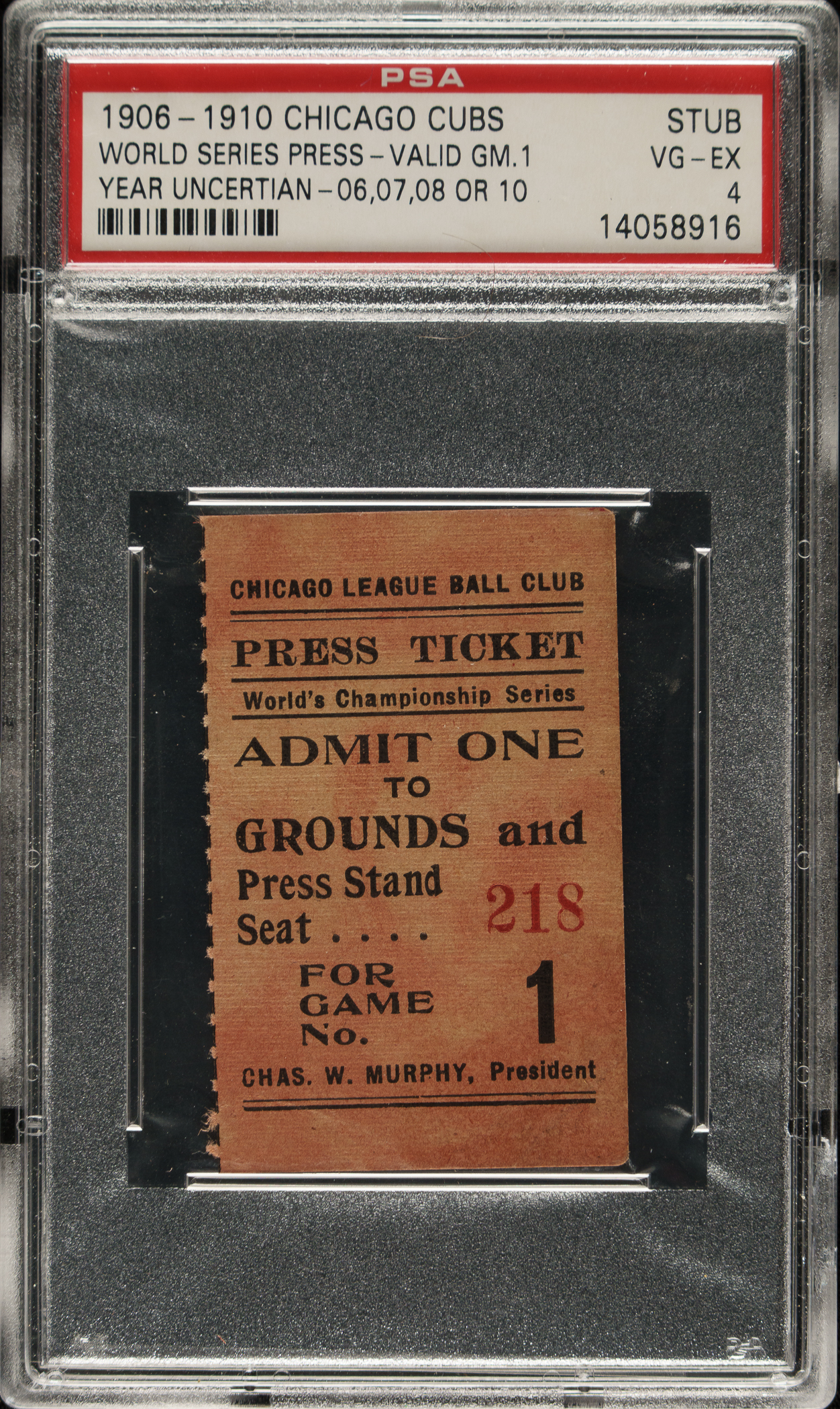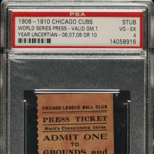 Offered is a World Series press ticket (undated, year not certain) issued for Game 1 held at the Cubs' West End Grounds in Chicago (possibly 1906, 1907, 1908, or 1910 "Fall Classic"). Graded VG-EX 4 by PSA. This is the ONLY example ever graded (at any level) by PSA! All World Series tickets from this era are rare, but tickets produced specifically for the press are rarer still. Between 1906 and 1910, the Chicago Cubs won four pennants and two World Championships, led by Hall of Famers Frank Chance, Johnny Evers, Joe Tinker, and Mordecai Brown. The ticket stub (1.5 x 2.5 inches) displays a couple light creases. An outstanding, and very rare, World Series press ticket from this early baseball dynasty.