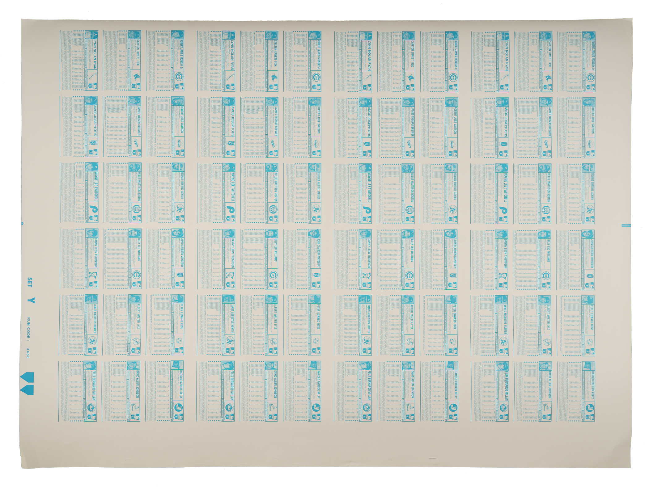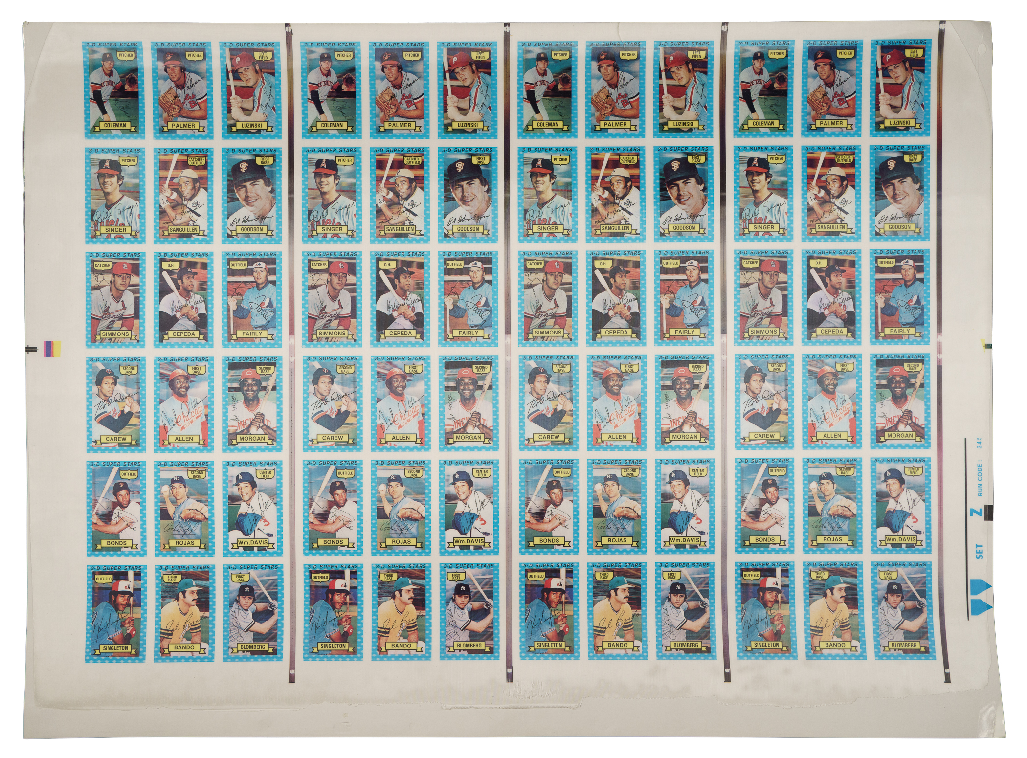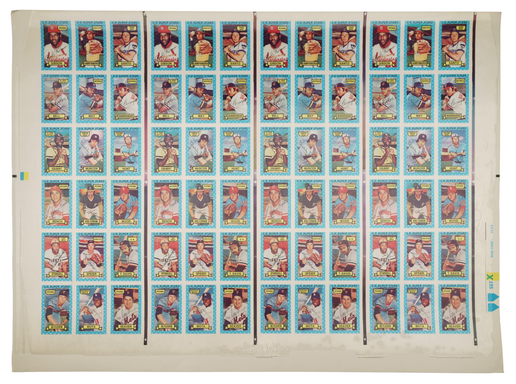 Presented are four complete 54-card 1974 Kellogg's 3-D sets in a rarely seen form: on three 72-card uncut sheets. The sheets (30 x 22 inches) are labeled "Set X" thru "Set Z." The three uncut sheets are all complete final process sheets with fully printed backs. Throughout the 1970s and early 1980s, the Kellogg's cereal company was the only true competition for Topps in the baseball-card market. This unique design concept, which lasted for 14 years, was achieved by placing a clear color player photo between a purposely blurred stadium background scene and a layer of plastic overlay. The nature of the plastic overlay causes the cards to curl, often cracking the plastic overlay, if not stored properly. This set includes dozens of stars and Hall of Famers, including Bob Gibson, Tom Seaver, Pete Rose, Nolan Ryan, Johnny Bench, and Reggie Jackson. Of course, instead of having to buy only a stick of gum to get a stack of cards, you had to buy an entire box of cereal just to get one card! This is the first 1974 Kellogg's set we have offered in this form. These sheets obviously originate from someone connected to the printing company (Xograph) or Kellogg's. It's possible they were used for proofing purposes. All three sheets display color bars along the right edge. There is no cracking to the plastic overlay. The backs are clean and boldly printed. This represents a phenomenal opportunity to acquire four complete sets of this unusual 1970s baseball series in an extremely scarce form. Total: 216 cards on three sheets. The size/weight of this item requires that there will be an additional shipping charge for this lot.