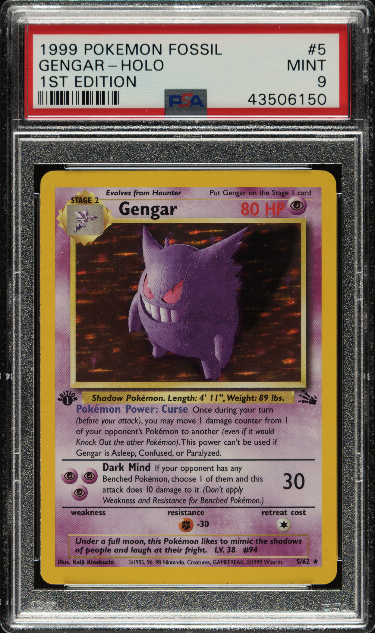 Lot # 2892: 1999 Pokemon Fossil 1st Edition #5 Gengar Holographic PSA MINT 9