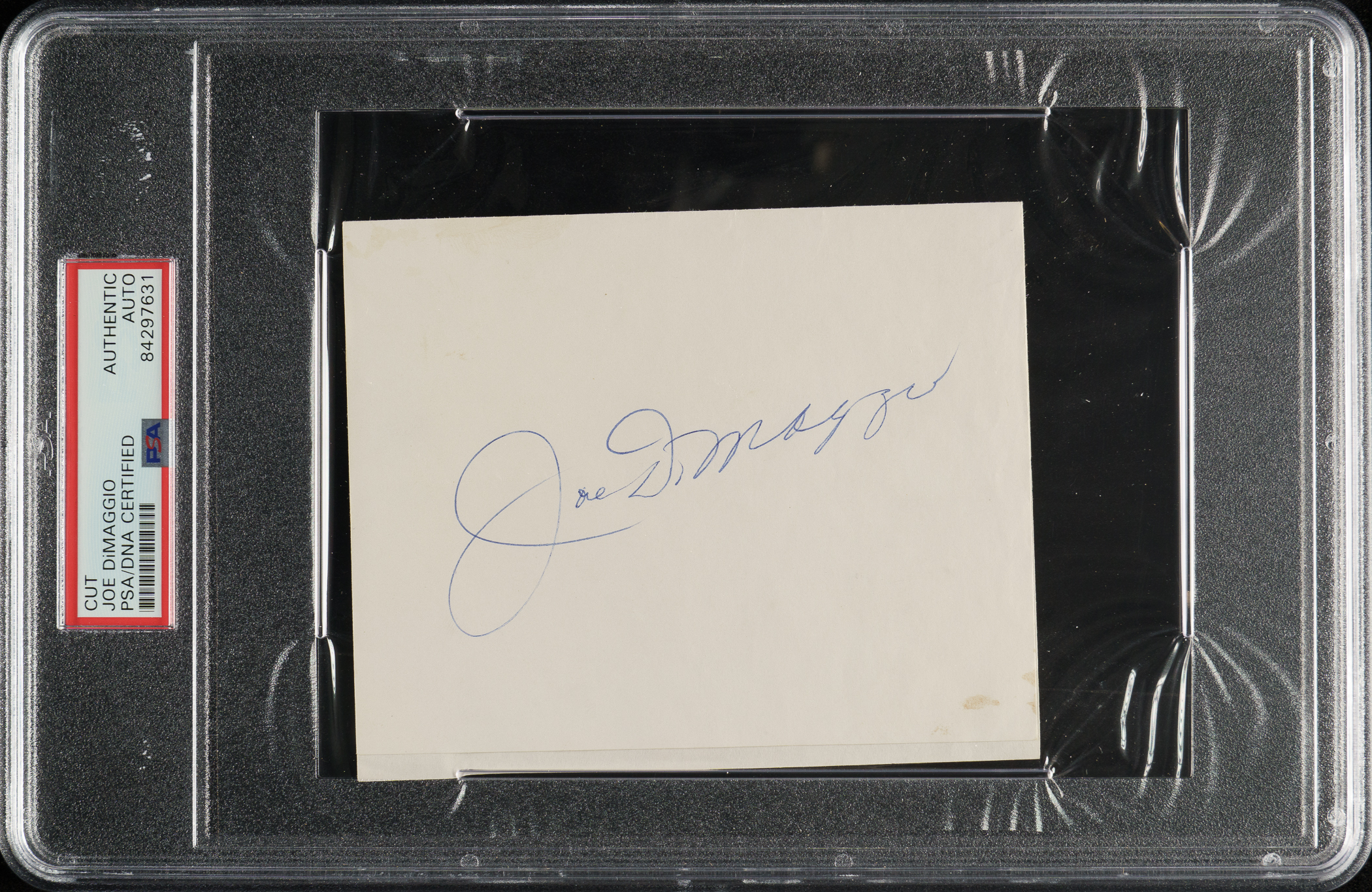 PSA/DNA has encapsulated the cut, grading the signature Authentic. New York Yankees Hall of Famer Joe DiMaggio.