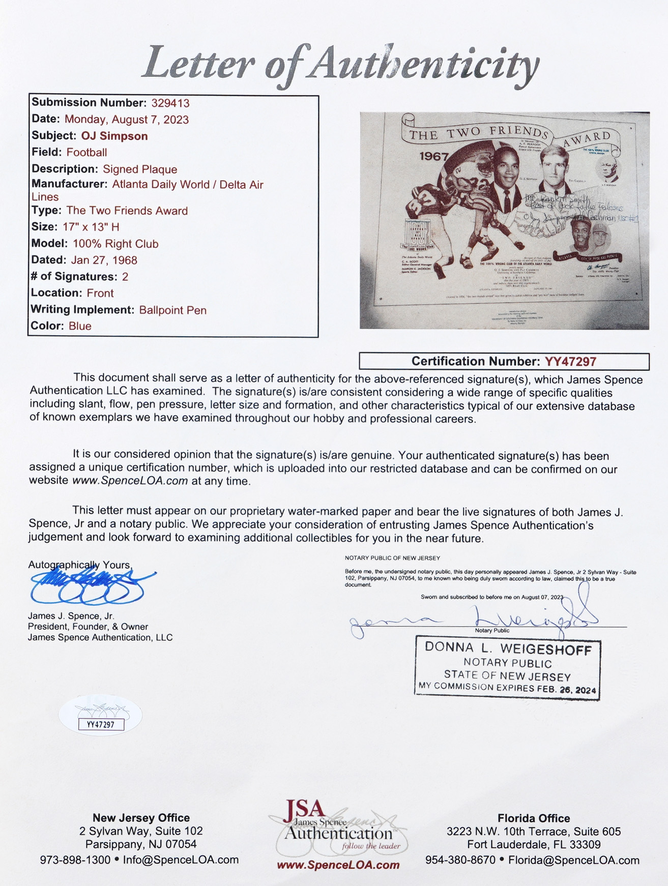 Fascinating plaque commemorating the 1967 "The Two Friends Award" bestowed upon O. J. Simpson and Pat Cashman by Atlanta's "The 100% Wrong Club." Both Simpson and Cashman were members of the University of Southern California football team, and each has signed in blue ballpoint pen underneath their pictures. Simpson has signed "O. Jay Simpson," a rare variation dating mostly to his collegiate days, while Cashman has signed his name along with the inscription "Mr. Rankin Smith, Best of luck to the Falcons, Pat Cashman USC #1." Rankin Smith was a prominent Atlanta businessman and founder of the Atlanta Falcons. This award, and the club responsible for its presentation, has a fascinating backstory. According to The Journal of Sports History, the "100% Wrong Club" united Black newspapers, colleges, and businesses in a “strategic congregation” that used the power of sport to both strengthen Black institutions and advance racial integration in American athletics. As noted on the award, in 1956, they designed "The Two Friends Award" to commemorate an "enduring friendship on and off the field of play." The inaugural winners were Jackie Robinson and Pee Wee Reese of the Brooklyn Dodgers. The offered plaque is noted on the bottom as a reproduction plaque presented to the coaching staff and members of the USC football team by Delta Air Lines. Measuring 17 x 13 inches, the plaque is on heavy particle board with a glossy front layer. It displays multiple minor condition issues, including staining along the bottom edge and the reverse as well as separation and cracking of the top layer in the top two corners. The important portraits and signatures are undisturbed. This represents a fascinating collectible from the early days of Simpson's professional football career. The size/weight of this item requires that there will be an additional shipping charge for this lot. Full LOA from James Spence/JSA.