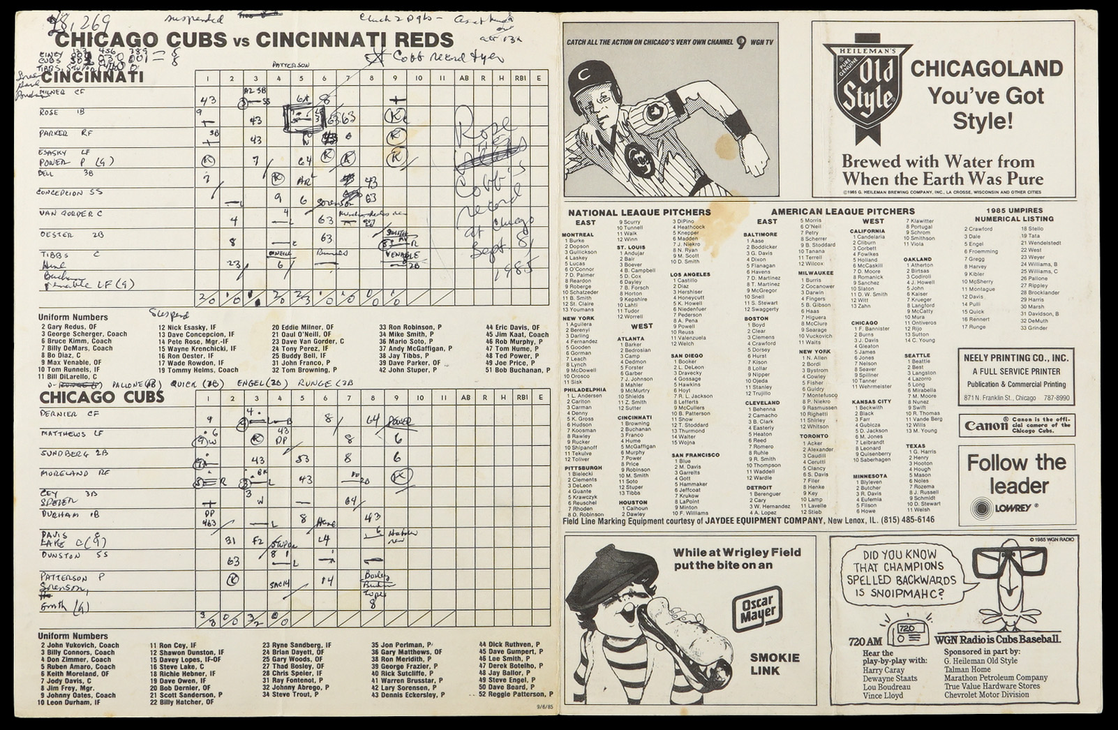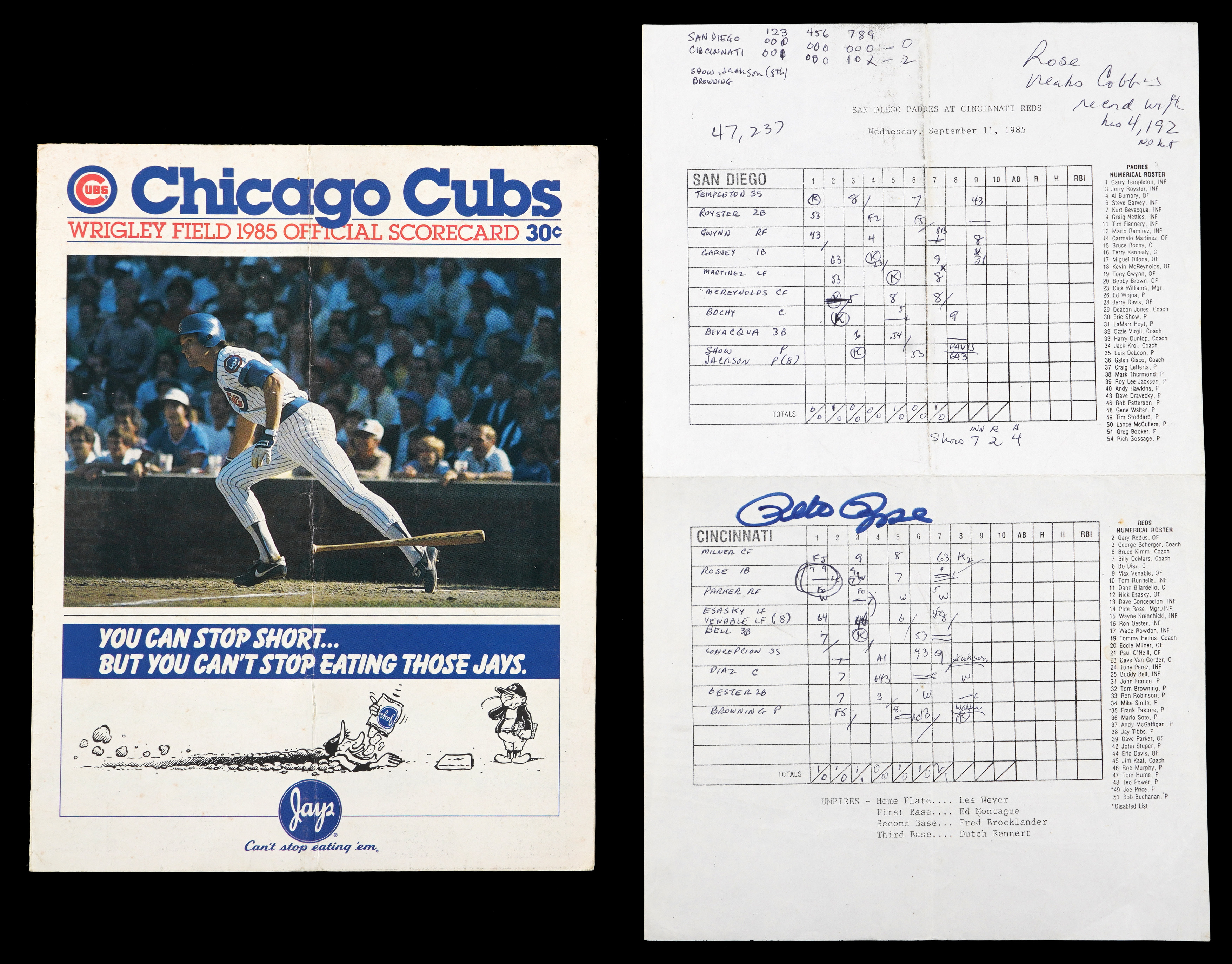 Pair of mementos dating to the games in which Cincinnati Reds star Pete Rose tied Ty Cobb's longstanding hits record and then subsequently broke the record. On September 8, 1985, Rose recorded two hits against the Chicago Cubs at Wrigley Field to tie Cobb's record of 4,191 career hits. Offered is a scorecard from that game, which has been fully scored and noted as the record-tying game within the scorecard section by the scorer. Picturing Hall of Famer Ryne Sandberg on the cover, the scorecard has been folded in half vertically and displays a heavy crease, but is otherwise in very good condition, with light toning on the scoring page but all notations are clean and legible. Accompanying the scorecard is a single-page scoresheet from the September 11, 1985, game in Cincinnati against the San Diego Padres. This sheet is the same style as those distributed within the press box to writers and others covering the game. According to our consignor, the sheet was obtained from Milton Richman, who was a columnist and editor for United Press International and subsequently was honored with the J. G. Taylor Spink Award from the BBWAA. The sheet has been folded in quarters, scored, and noted as the record-breaking game. Pete Rose has signed in blue Sharpie above the Cincinnati Reds box score. This is an interesting pair of items relating to this monumental event. Auction LOA from James Spence/JSA. Total: 2 items. The size/weight of this item requires that there will be an additional shipping charge for this lot.