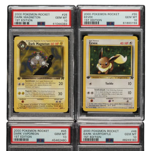 Collection of twenty 2000 Pokemon Rocket 1st Edition cards, each graded and encapsulated GEM MINT 10 by PSA. This collection consists of the following: #28 Dark Magneton, 34, 41 Dark Muk, 45 Dark Vaporeon, 46 Dark Wartortle, 49, 51, 54, 55, 56, 57, 60, 61, 62, 63, 66, 67, 69, 71, and 78. Total: 20 cards.