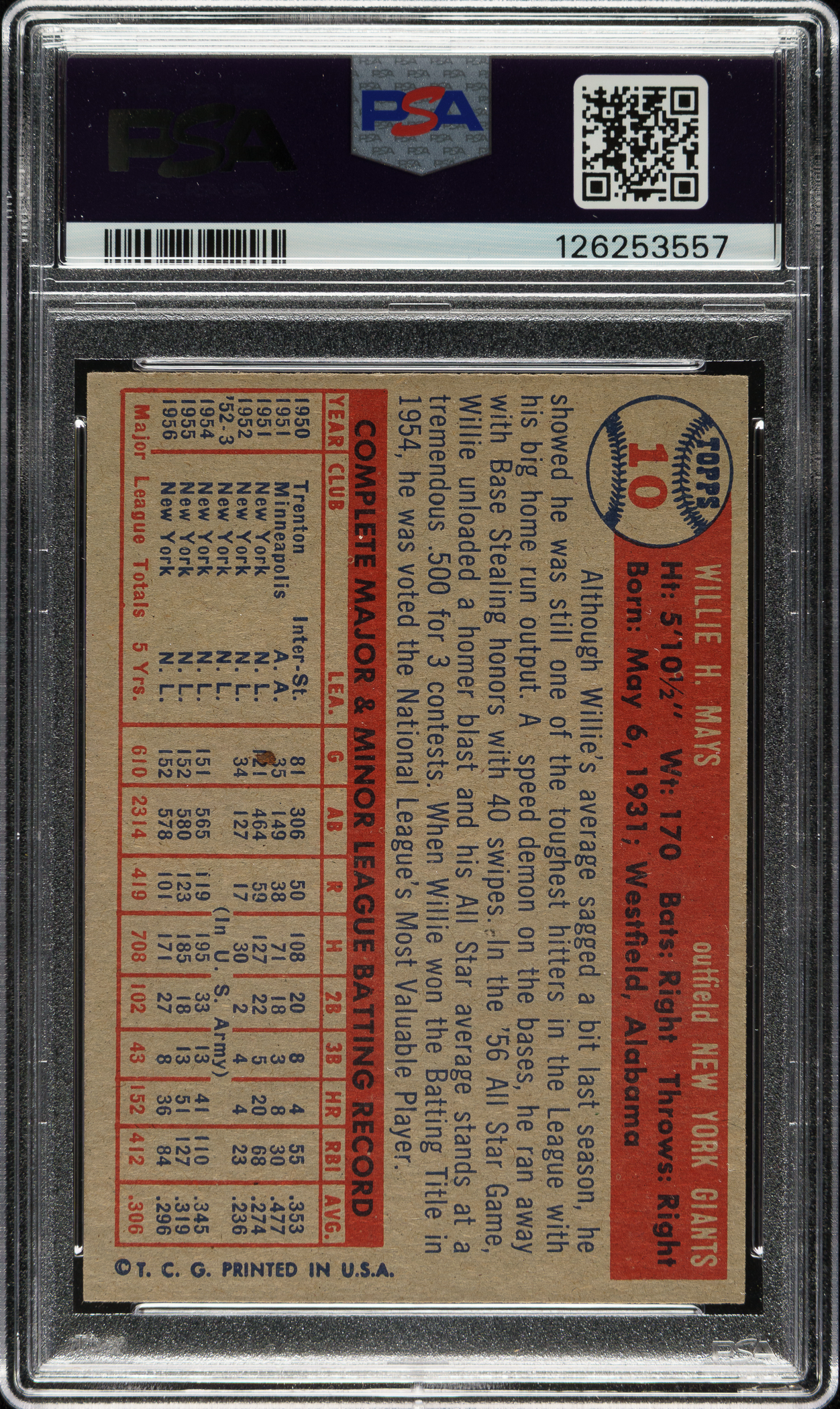 Graded NM-MT 8 by PSA (submitted by REA). New York Giants Hall of Famer Willie Mays.