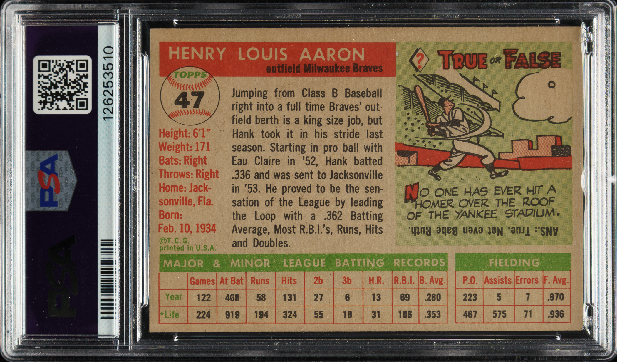 Graded EX-MT+ 6.5 by PSA (submitted by REA). Milwaukee Braves Hall of Famer Hank Aaron.