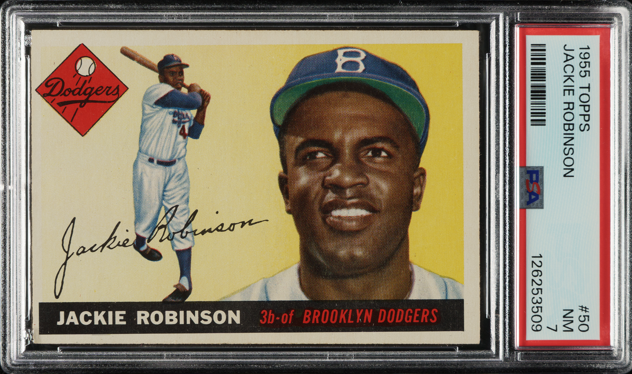Graded NM 7 by PSA (submitted by REA). Brooklyn Dodgers Hall of Famer Jackie Robinson.