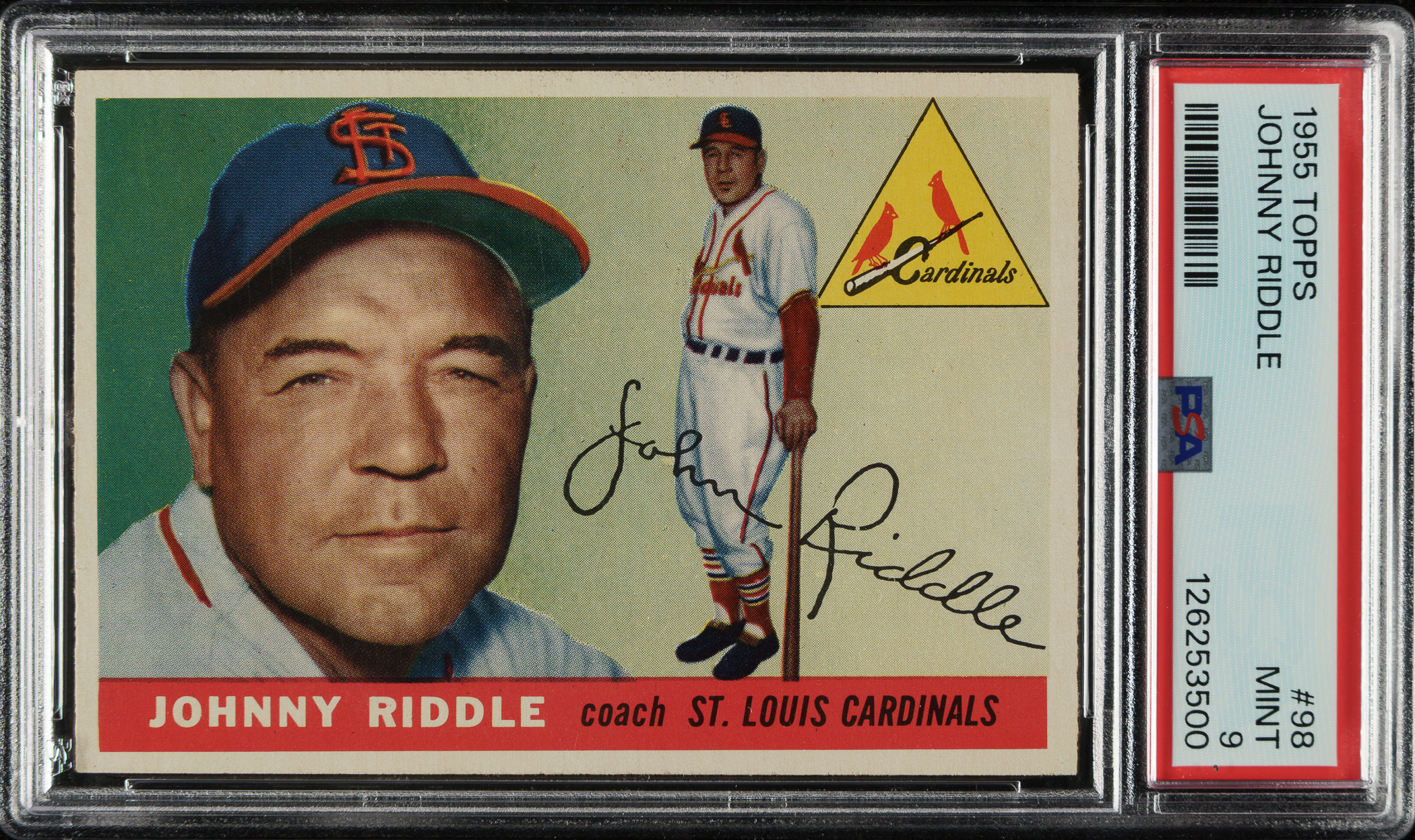 Graded MINT 9 by PSA (submitted by REA). St. Louis Cardinals. Only three examples grade higher out of 820 cards evaluated by PSA to date.