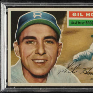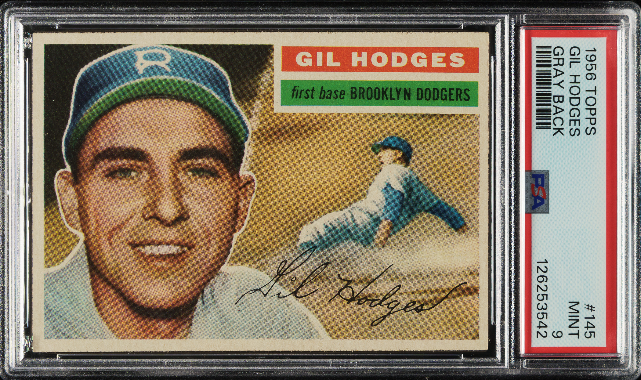 Graded MINT 9 by PSA (submitted by REA). Brooklyn Dodgers Hall of Famer Gil Hodges. Only one example grades higher out of more than 2,320 cards (gray and white backs) evaluated by PSA to date.