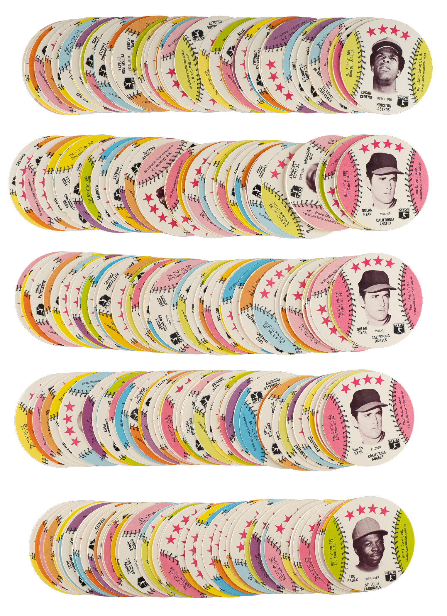 Presented is a very attractive high-grade collection of five complete sets of 1976 Isaly's/Sweet William Discs (70 discs per set). The collection includes an impressive 115 Hall of Famers (23 per set), highlighted by Hank Aaron, Johnny Bench, Nolan Ryan, Mike Schmidt, and Tom Seaver. Originally distributed as a premium at Pittsburgh-area Isaly's stores and Sweet William restaurants, a large quantity of leftover discs eventually found its way into the hobby. These high-grade sets are in uncirculated condition, grading Nr/Mt-Mt to Mint overall, with approximately 8% lesser (due mostly to centering). A very substantial collection of this unusual regional issue, loaded with stars and Hall of Famers. Total: 350 cards. The size/weight of this item requires that there will be an additional shipping charge for this lot.