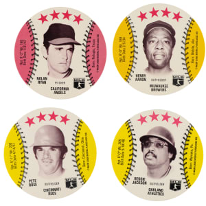 Presented is a very attractive high-grade collection of five complete sets of 1976 Isaly's/Sweet William Discs (70 discs per set). The collection includes an impressive 115 Hall of Famers (23 per set), highlighted by Hank Aaron, Johnny Bench, Nolan Ryan, Mike Schmidt, and Tom Seaver. Originally distributed as a premium at Pittsburgh-area Isaly's stores and Sweet William restaurants, a large quantity of leftover discs eventually found its way into the hobby. These high-grade sets are in uncirculated condition, grading Nr/Mt-Mt to Mint overall, with approximately 8% lesser (due mostly to centering). A very substantial collection of this unusual regional issue, loaded with stars and Hall of Famers. Total: 350 cards. The size/weight of this item requires that there will be an additional shipping charge for this lot.