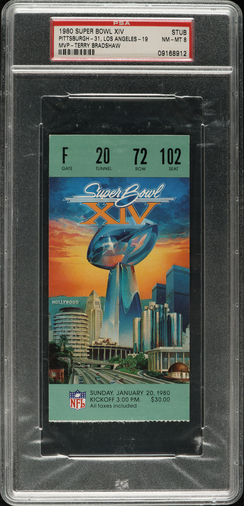 Graded NM-MT 8 by PSA. Pittsburgh Steelers football Hall of Famer Terry Bradshaw.