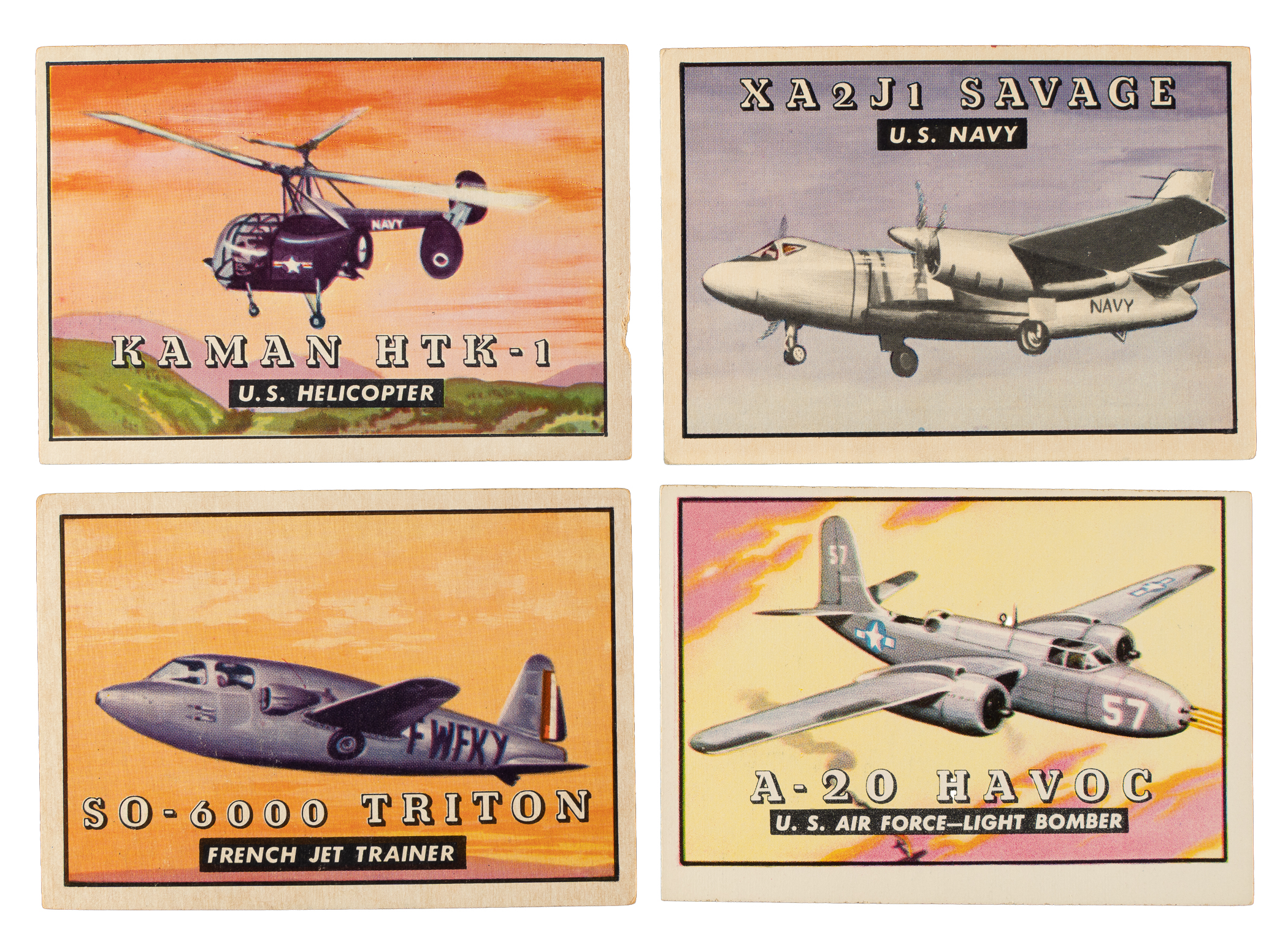Presented is an attractive mid-grade collection of 1953 Topps "Wings" consisting of a partial set of 136 different cards (out of 200 in the set) plus 71 duplicates. Condition is 28% Vg-Ex (including some Ex), 57% Gd to Vg, and 15% Pr to Fr (including one trimmed). Missing the following sixty-four cards for completion: #2, 3, 4, 5, 7, 9, 11, 12, 15, 19, 21, 23, 24, 28, 29, 30, 31, 33, 38, 39, 41, 45, 49, 60, 61, 72, 86, 91, 94, 95, 100, 101, 104, 105, 113, 114, 117, 120, 121, 122, 125, 126, 127, 129, 131, 132, 133, 139, 145, 147, 148, 154, 165, 171, 172, 173, 174, 177, 179, 183, 188, 189, 194, and 200. Includes the following seventy-one duplicates: #6, 17, 20, 22, 37, 43, 50, 51, 52, 55, 56, 58, 59, 67, 69, 73, 74, 76, three 80, 81, three 82, two 83, four 85, 87, 92, 93, 103, two 107, 109, 112, 116, 119, two 123, 128, 134, 136, 143, two 144, 146, 156, two 159, 161, 163, two 164, 167, 178, two 180, 181, 184, two 186, two 196, 197, and three 199. Total: 207 cards (partial set of 136 plus 71 duplicates).