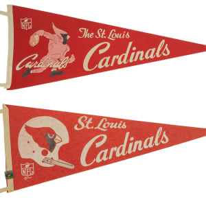 Collection of four football pennants dating from the 1940s to the 1960s. This collection consists of the following: 1-2) 1960s St. Louis Cardinals (different), multiple tiny holes, both otherwise Gd-Vg. 3) 1967 St. Louis Cardinals, multiple tiny holes, otherwise Vg. 4) 1967 San Francisco 49ers, multiple tiny holes, otherwise Vg-Ex. Total: 4 pennants. The size/weight of this item requires that there will be an additional shipping charge for this lot.