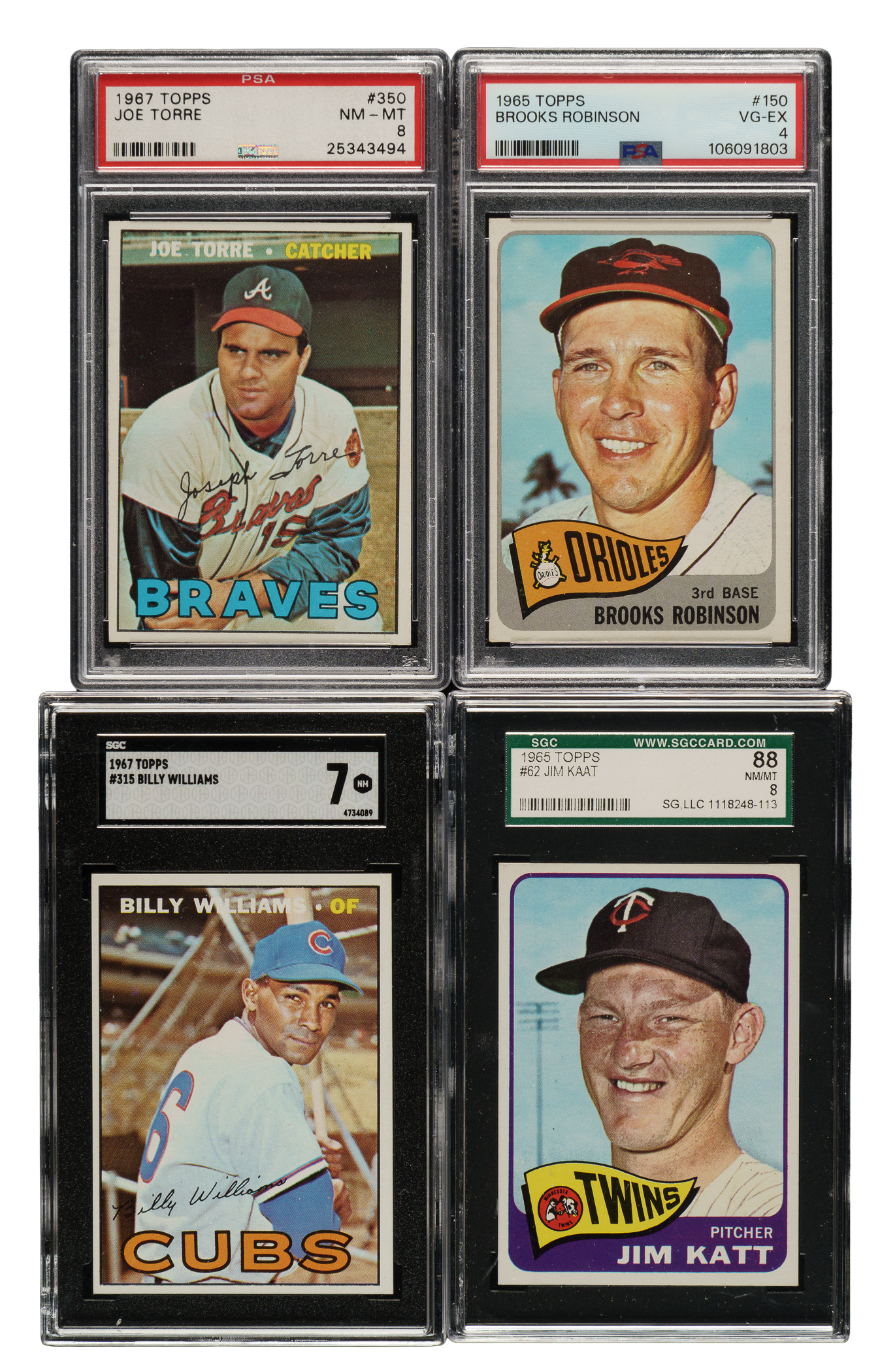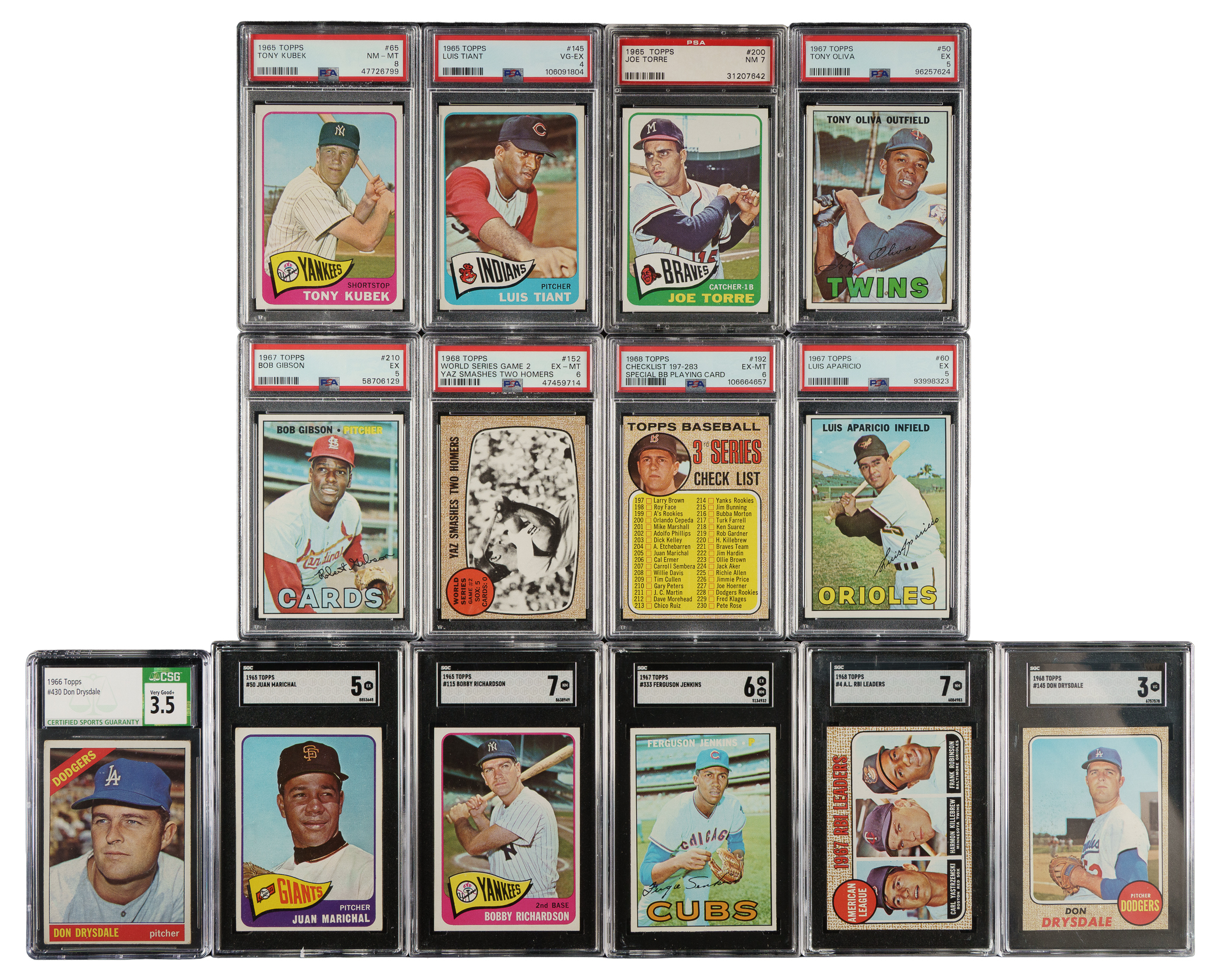 Collection of eighteen 1965 to 1968 Topps cards, featuring Boston Red Sox, San Francisco Giants, and Baltimore Orioles Hall of Famers Carl Yastrzemski, Juan Marichal, and Brooks Robinson. Each card has been graded and encapsulated by PSA (10), SGC (7), or CSG (1). This collection consists of the following: 1) 1965 Topps (7 cards): #50 Marichal (SGC EX 5), 62 Kaat (SGC NM/MT 88), 65 (NM-MT 8), 115 (SGC NM 7), 145 (VG-EX 4), 150 B. Robinson (VG-EX 4), and 200 Torre (NM 7). 2) 1966 Topps (1 card): #430 Drysdale (CSG VG+ 3.5). 3) 1967 Topps (6 cards): #50 Oliva (EX 5), 60 Aparicio (EX 5), 210 Gibson (EX 5), 315 Williams (SGC NM 7), 333 Jenkins (SGC EX/NM 6), and 350 Torre (NM-MT 8). 4) 1968 Topps (4 cards): #4 A. L. RBI Leaders with Yastrzemski/Killebrew/F. Robinson (SGC NM 7), 145 Drysdale (SGC VG 3), 152 World Series Game 2 with Yastrzemski (EX-MT 6), and 192 Checklist (EX-MT 6). Total: 18 cards. The size/weight of this item requires that there will be an additional shipping charge for this lot.