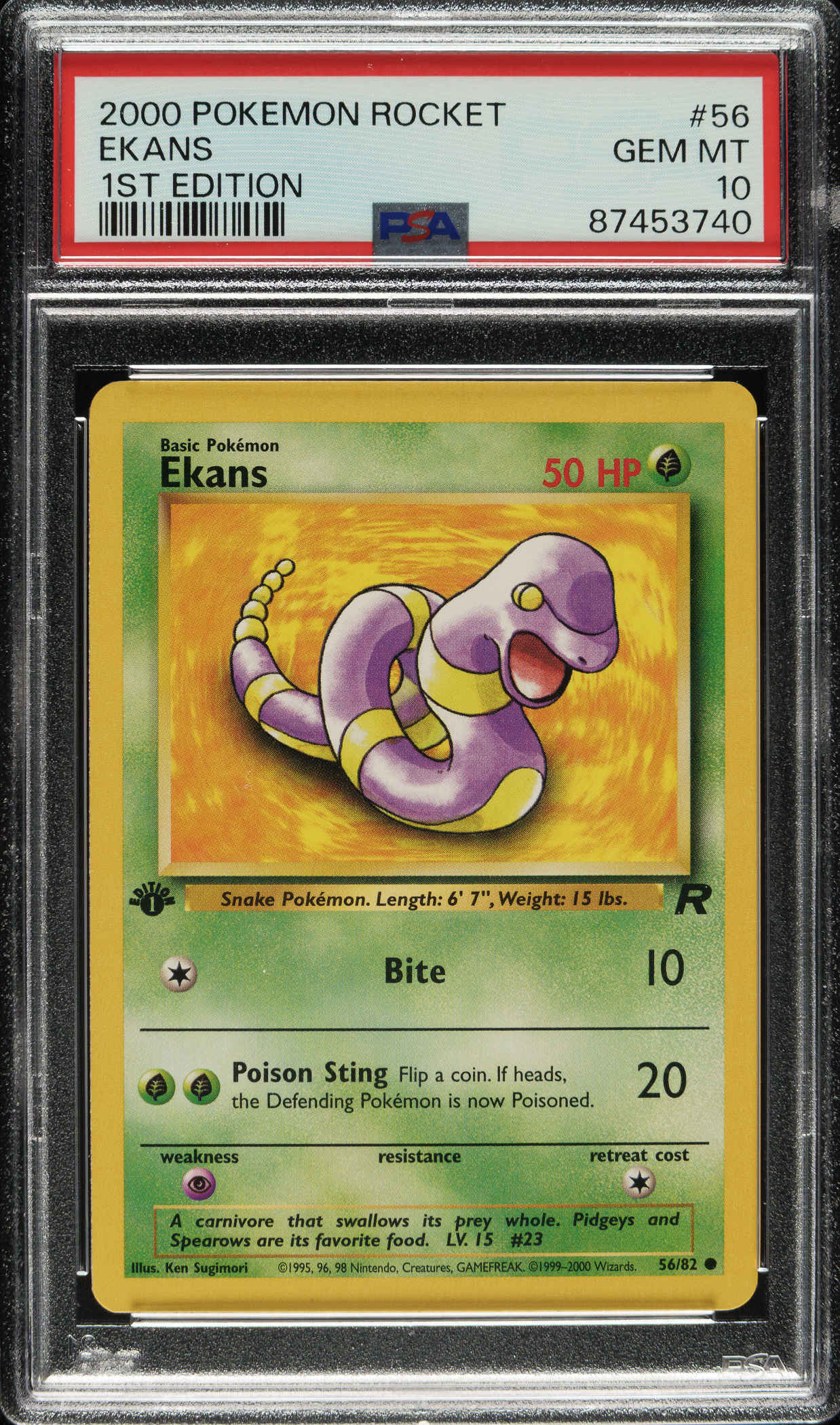 Lot # 3507: 2000 Pokemon Rocket 1st Edition #56 Ekans PSA GEM MINT 10