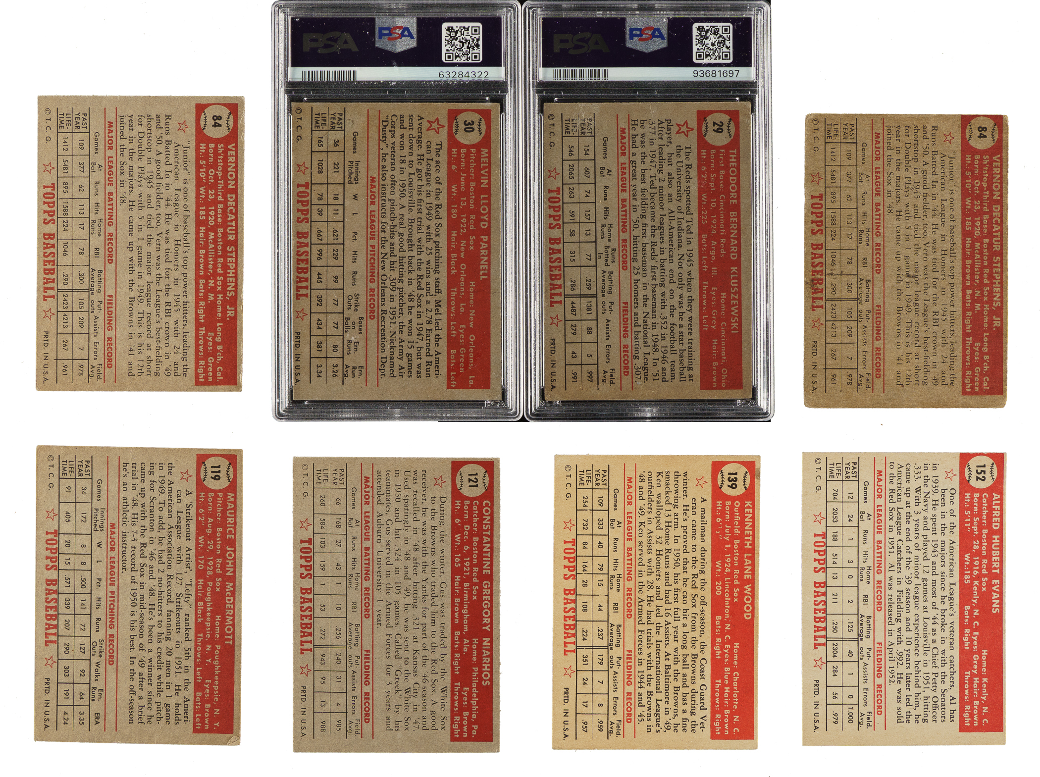 Collection of eight 1952 Topps low-number cards. Two cards have been graded and encapsulated by PSA. This collection consists of the following: #29 (GOOD 2), 30 (GOOD 2), two 84 (Vg-Ex and Gd), 119 (Vg+), 121 (Vg-Ex), 139 (Vg+), and 152 (Vg-Ex). Total: 8 cards.