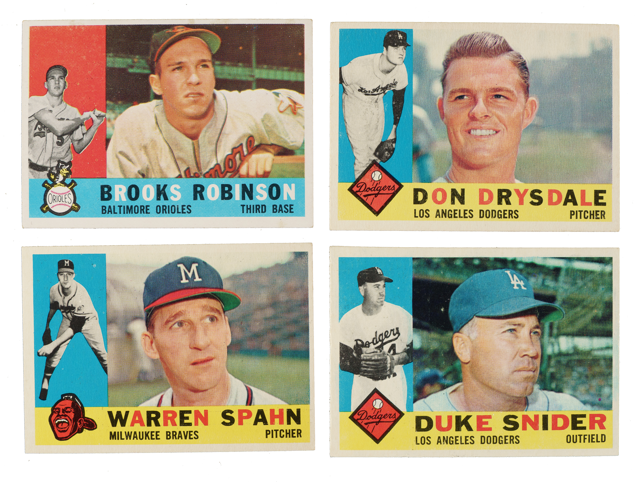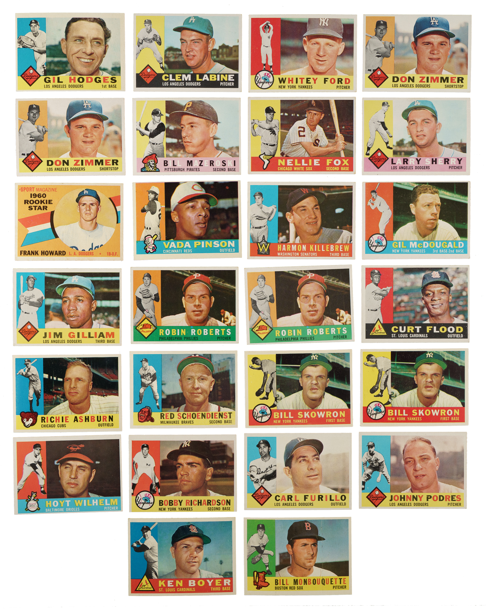 Collection of thirty 1960 Topps cards, highlighted by fourteen Hall of Famers, including Duke Snider, Harmon Killebrew and Brooks Robinson. Condition is 32% Ex to Ex-Mt (mostly Ex) and 68% Vg to Vg-Ex (including a couple lesser). This collection consists of the following: #28 B. Robinson (Ex), 29, 35 Ford (Vg-Ex), two 47, 55 Mazeroski (Vg), 100 Fox (Vg), 105, 132 Howard RC, 176, 210 Killebrew (Vg), 247, 255, two 264 Roberts (Ex and Vg+), 275, 295 Hodges (Ex), 305 Ashburn (Vg-Ex+), 335 Schoendienst (Ex), two 370, 395 Wilhelm (80/20 T/B, otherwise Ex-Mt), 405, 408 Furillo, 425, 445 Spahn (Ex), 475 Drysdale (Vg-Ex+), 485, 493 Snider (Vg-Ex), and 544. Total: 30 cards.