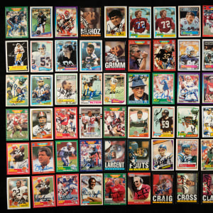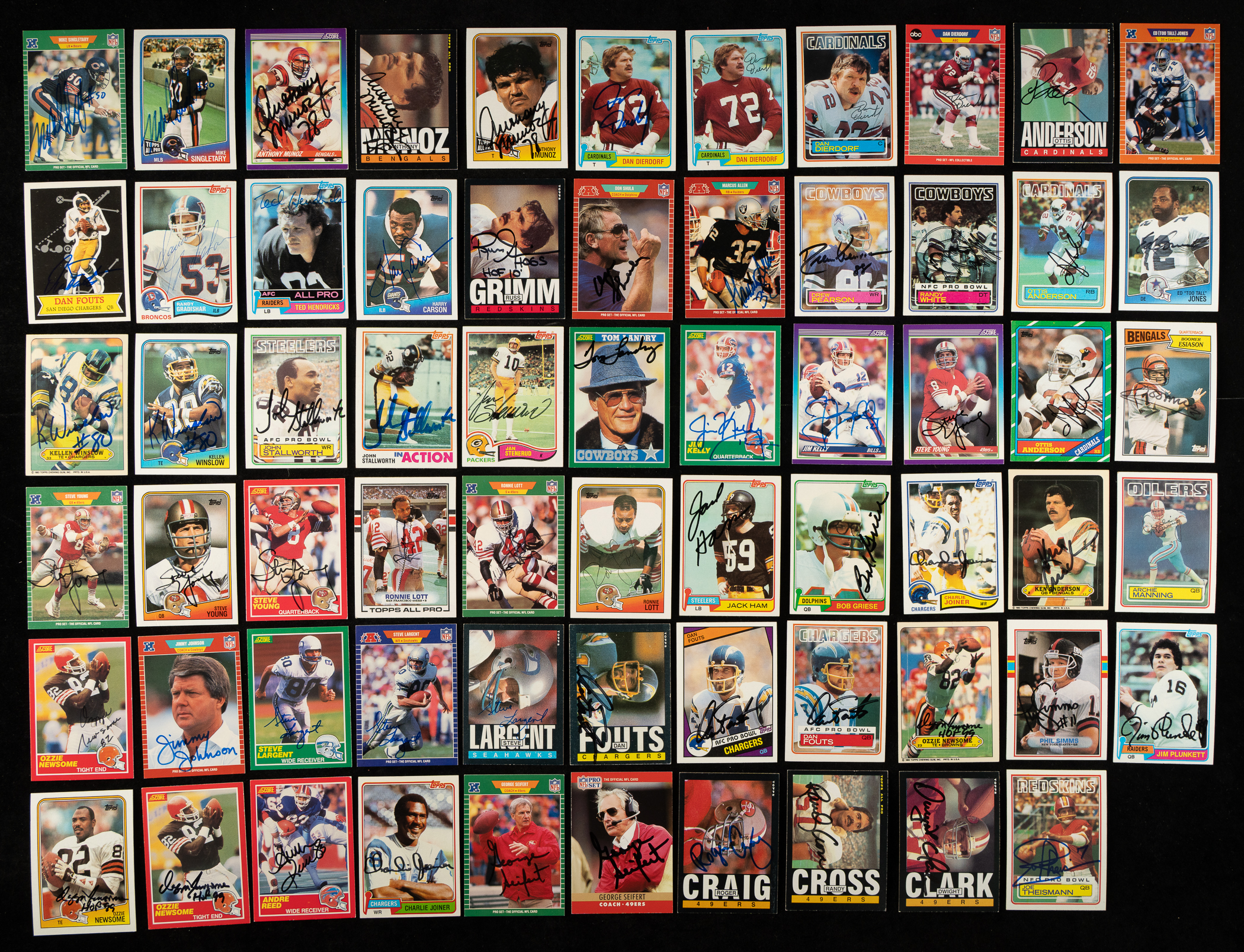 Sizable collection of 199 signed football cards, representing many different issues (Topps, Score, and Pro Set) spanning the years 1981 to 1990, including 52 featuring the signature of a Hall of Fame player. The signatures are scripted on the front of the cards in various inks. Condition is 22% Nr/Mt to Nr/Mt-Mt, 48% Ex to Ex-Mt, and 30% Vg to Vg-Ex (including a few lesser). This collection consists of the following: Allen (HOF), two K. Anderson, three O. Anderson, two W. Anderson, two Bartkowski, two Bavaro, three Brister, Cappelletti, Carson (HOF), Carter, two Case, two Cherry, seven D. Clark, five Collinsworth, seven Craig, Cromwell, four Cross, DeBerg, two Dickey, four Dierdorf (HOF), Dupree, Esiason, two Evans, Ferguson, Fourcade, four Fouts (HOF), Gault, Gradishar (HOF), two Gray, Green, Greene (HOF), Griese (HOF), Grimm (HOF, 'HOF 10'), Grogan, Ham (HOF), Hanratty, three Hart, Hendricks (HOF), two Herbert, Hicks, Hoge, three Jaworski, two Jeffcoat, J. Johnson (HOF), two Joiner (HOF), two B. Jones, two E. Jones, two Kelly (HOF), two Kosar, Krieg, G. Landy, T. Landry (HOF), three Largent (HOF), Lewis, two Lipps, eleven Lomax, three Lott (HOF), two Majkowski, A. Manning, Martin, McMahon (personalized), McMillan, Mecklenburg, Miller, Mitchell, two Morgan, three Munoz (HOF), Neuheisel, four Newsome (three 'HOF 99,' HOF), Novacek, Offerdahl, two Okoye, Pearson (HOF), Plank, Plunkett, Randy White (HOF), three Rathman, Reaves, Reed (HOF), Robinson, Rozier, two Seifert, Sharpe, Shula (HOF), Sikahema, Simms, two Sims, two Singletary (HOF), Sipe, two Stallworth (HOF), Stenerud (HOF), Taylor (HOF), five Theismann, three Tilley, two Tolliver, two Townsell, two Tupa, Verdin, two D. White, D. Williams, Willis, two Winslow (HOF), Woodson (HOF), four Young (HOF), and three Zorn. Total: 199 signed cards. Auction LOA from James Spence/JSA.