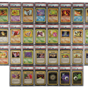 Collection of thirty-four 2000 Pokemon Team Rocket 1st Edition cards, each graded and encapsulated by PSA. The Team Rocket series is widely considered to be the most desirable Pokemon set from the second year of issue because it marks the first appearance of "Dark" Pokemon in the trading card game. The cards are numbered 1 to 82, but the set is highlighted by a rare, secret 83rd card, Dark Raichu Holographic, which was produced in a limited-edition run. PSA Grading Composite: MINT 9 (33 cards): #27 Machamp, 33 Dark Dragonair, 36, 37, 39, 40, 42, 43, 44, 47, 48, 51, 52, 56, 57, 58, 59, 61, 63, 64, 66, 70, 72, 73, 74, 75, 76, 77, 78, 79, 80, 81, and 82. NM-MT 8 (1 card): #21 Dark Charizard. Total 34 cards.