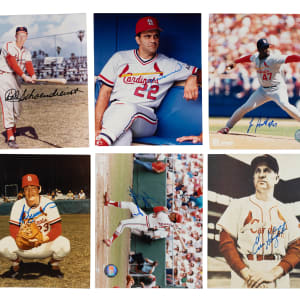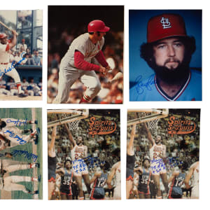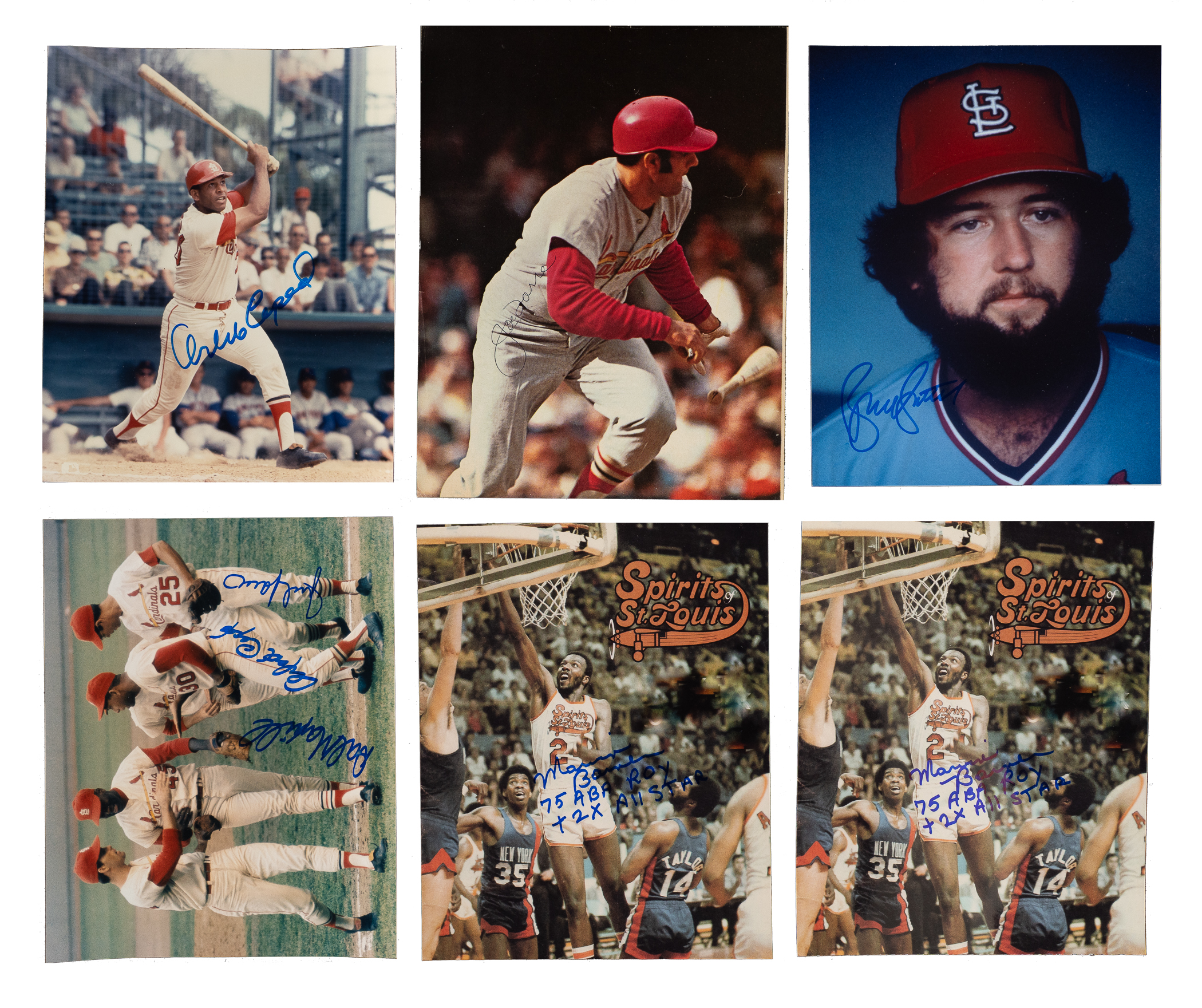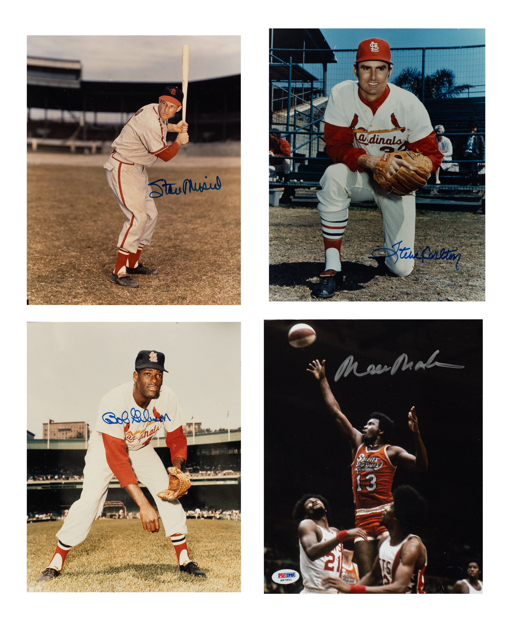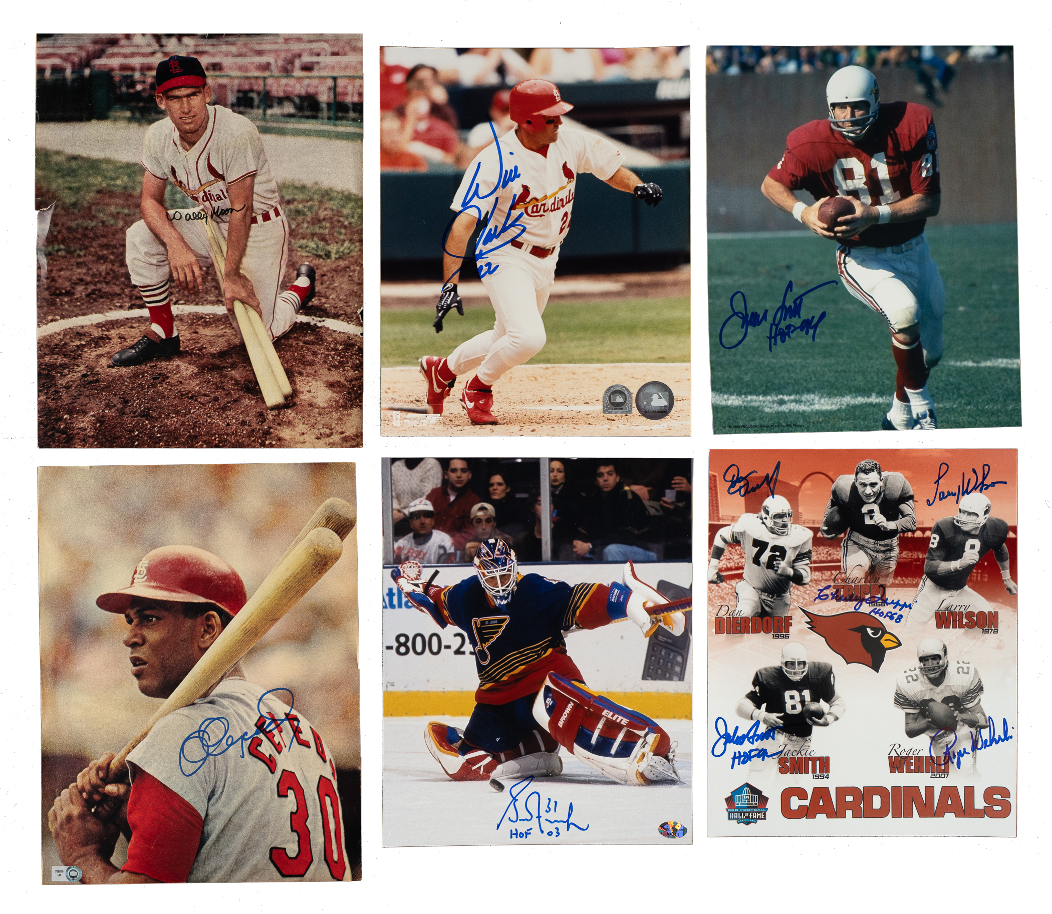 This diverse signature collection, composed of 87 signed photos (including eight magazine pages), features the autographs of subjects from four different athletic fields: baseball, football, basketball, and hockey. This group is composed of players affiliated with the St. Louis Cardinals (baseball), St. Louis Blues (hockey), Arizona/St. Louis Cardinals (football), and St. Louis Spirits (basketball). The photos remain in overall Excellent or better condition, while the magazine pages are lesser ranging from Fair to Very Good condition. This collection consists of the following: 1) Baseball (43): Boyer, Carlton, Cedeno, two Cepeda (one magazine page), W. Clark, J. Clark, C. Cooper, Drew, Forsch, Tito Francona, Gibson, K. Hernandez, four Javier (magazine page), Kaat, Kile, Mahaffey, T. Martinez (magazine page), three Moon (one 1954 NL R.O.Y., one magazine page), Musial, D. Porter, Schoendienst, Simmons, Slaughter, Van Slyke, L. Smith, two R. Smith, Stallard, Sutter, Templeton, two Tolan, two Torre (one magazine page), Torrez, and Maxvill/Cepeda/Javier. 2) Football (36): O. Anderson, Bakken, Banks, Conrad, Dobler, Esiason, P. Fischer, two Gilliam, Gray, three Hart (one magazine page), six Charlie Johnson (two magazine pages), Lomax, McCown, McMahon, two T. Metcalf, Stump Mitchell, R. Moore, Otis, Plummer, S. Randle, F. Sanders, Jackie Smith (HOF 94), J. Stovall, Warner, Wehrli, Larry Wilson (HOF 78), and Dierdorf/Trippi/Wilson/Smith/Wehrli (multi-signed Cardinals Hall of Fame ad). 3) Hockey (5): Berneson, Federko, Fuhr (HOF 03), K. Tkachuk, and Unger. 4) Basketball (3): Two Marvin Barnes (St. Louis Spirits, 75 ABA ROY, 2X All Star) and Moses Malone (St. Louis Spirits). Total: 87 signed photographs. Auction LOA from James Spence/JSA.