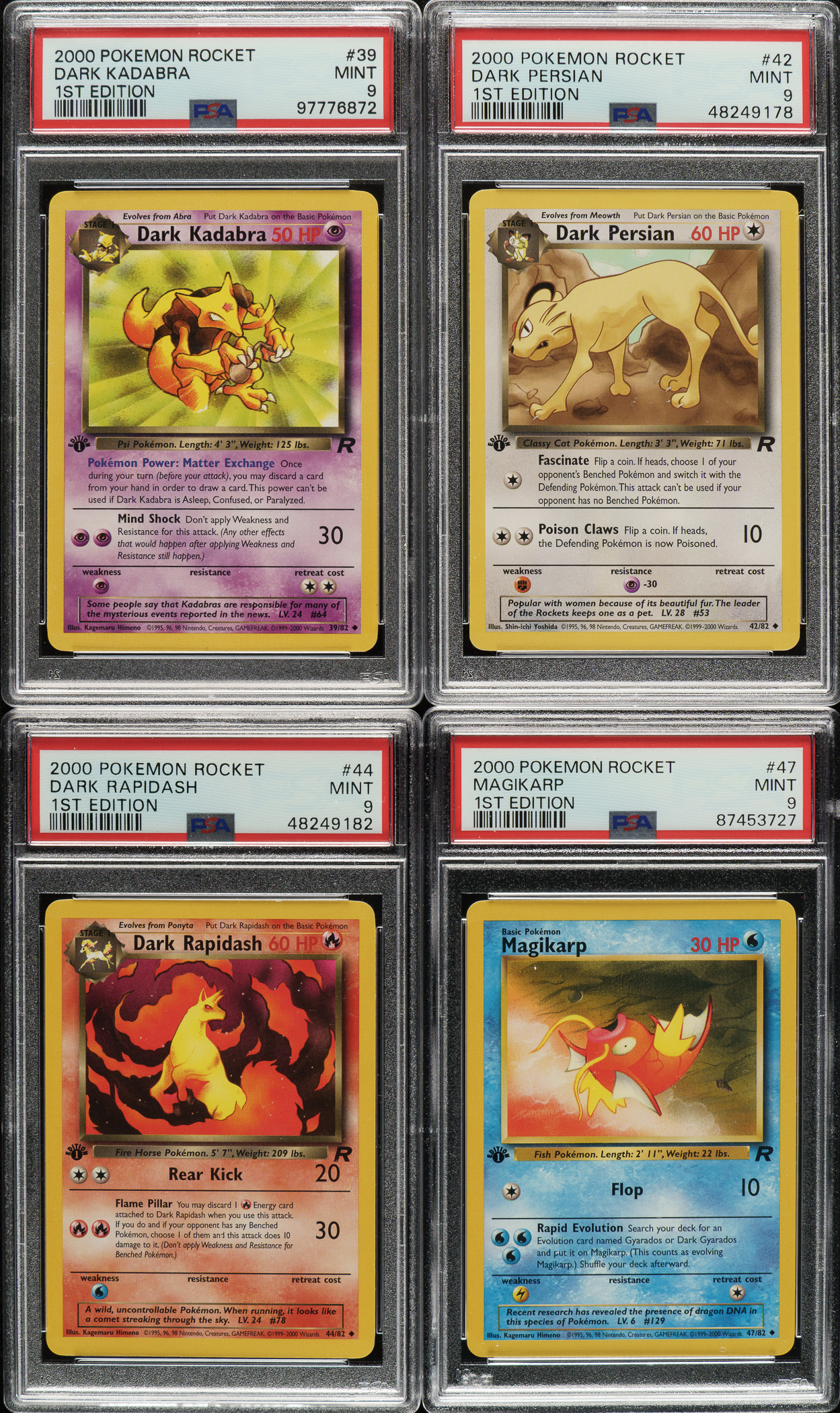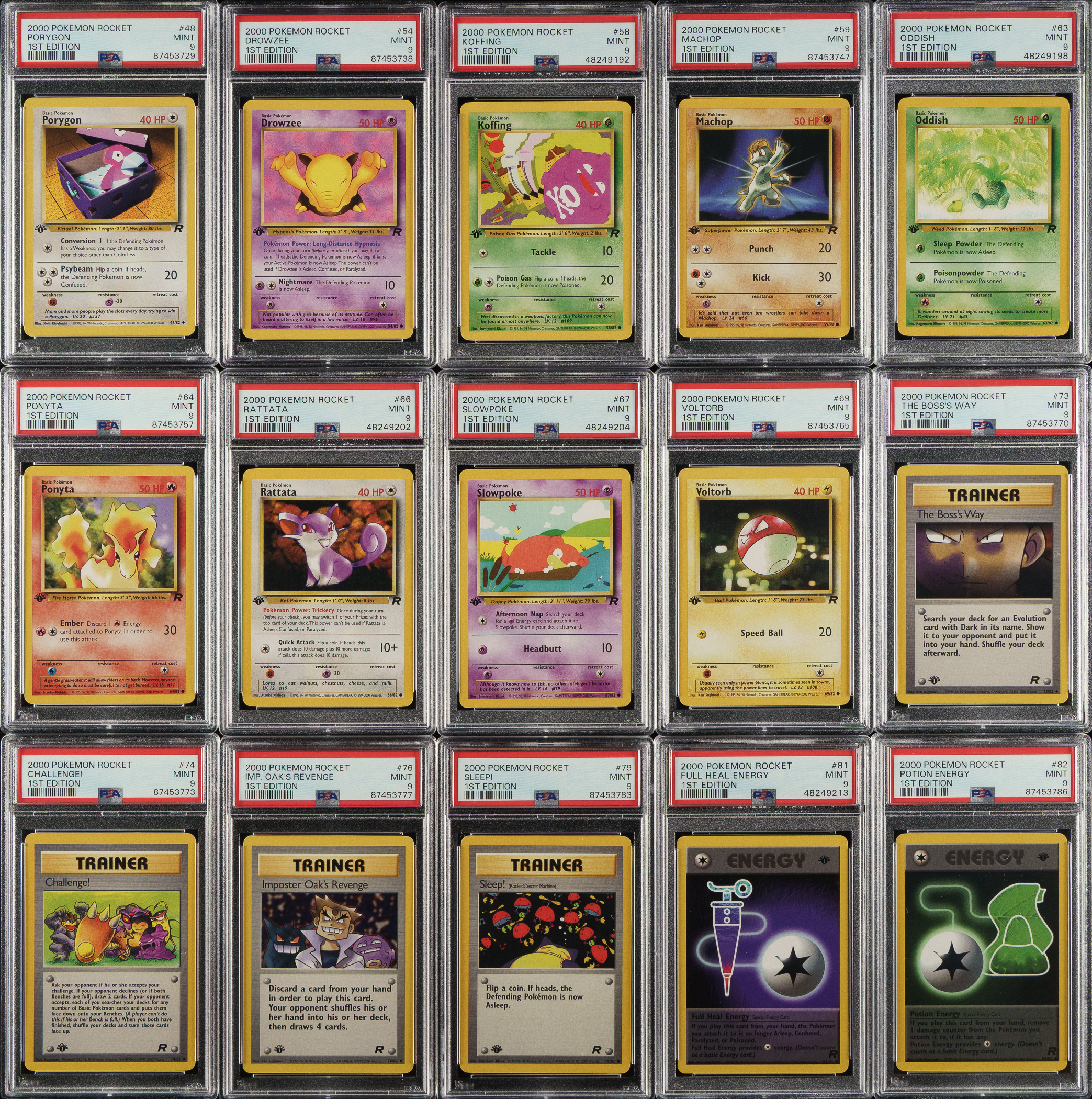 Collection of nineteen 2000 Pokemon 1st Edition Rocket cards, each graded and encapsulated by PSA as MINT 9. This collection consists of the following: #39, 42, 44, 47, 48, 54, 58, 59, 63, 64, 66, 67, 69, 73, 74, 76, 79, 81, and 82. Total 19 cards. The size/weight of this item requires that there will be an additional shipping charge for this lot.