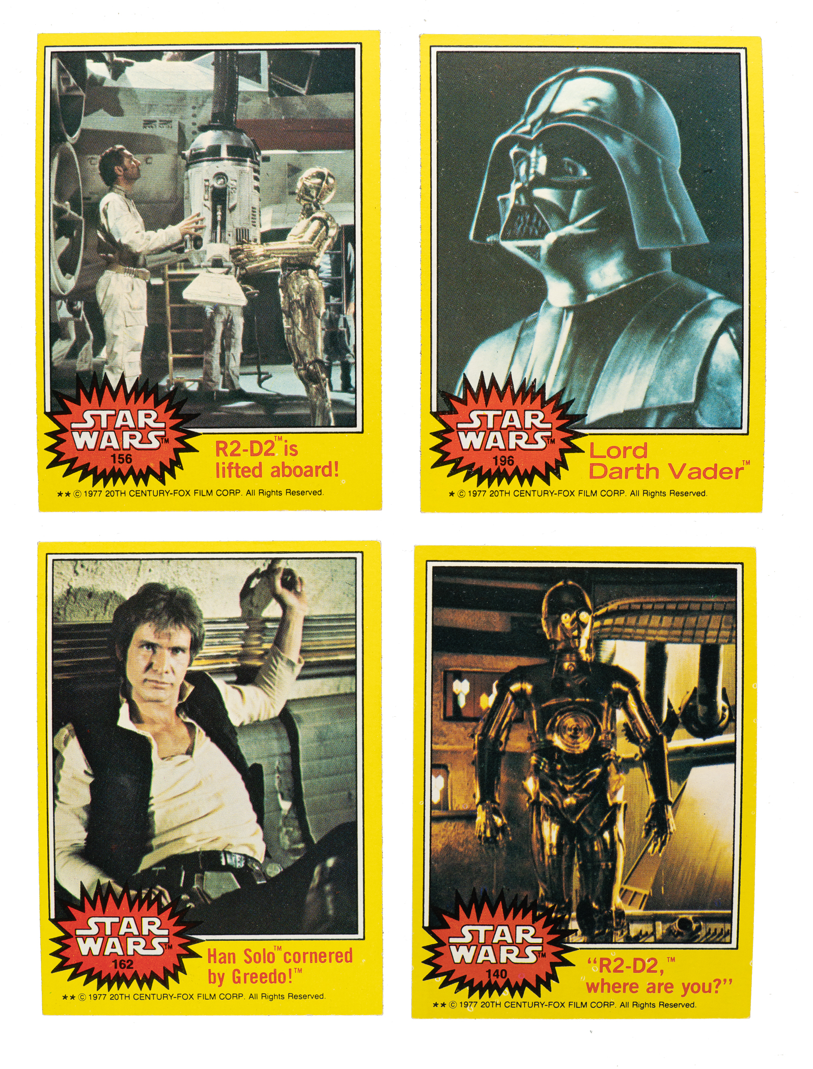 Complete 66-card set of 1977 Topps "Star Wars" Third Series (#133-198). Condition is 22% Nr/Mt or better, 49% Ex to Ex-Mt, 19% Vg to Vg-Ex, and 10% lesser (due to spots of paper loss on the reverse). Total: 66 cards. The size/weight of this item requires that there will be an additional shipping charge for this lot.