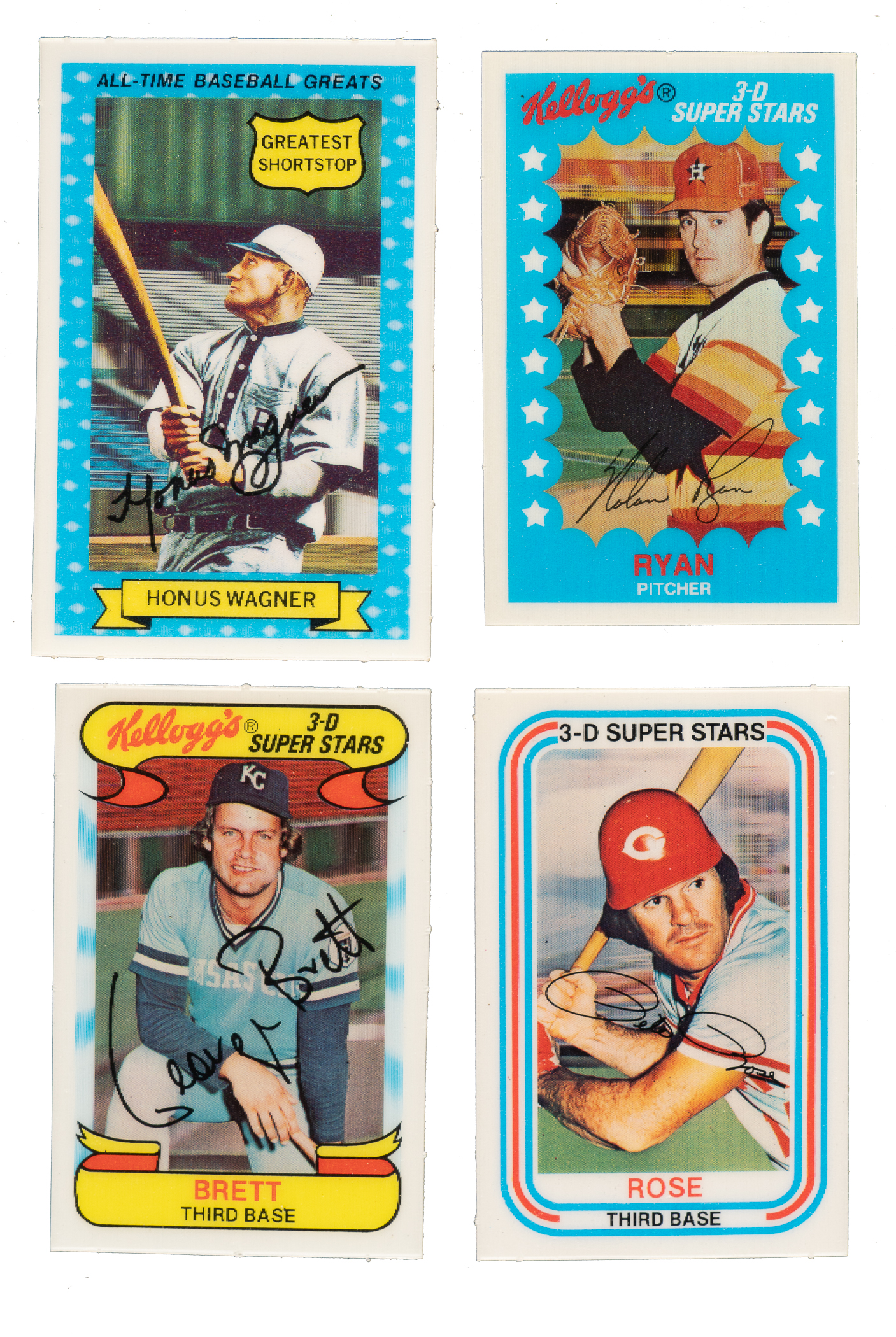 12) 1982 Kellogg's 3-D Near-Complete Set (62/64): Ranging from Ex-Mt to Mint (averaging Nr/Mt+), with approximately 7% lesser. Keys: #11 Ryan (Ex-Mt), and 18 Rose (Ex). Missing the following two cards for completion: #8 and 47.