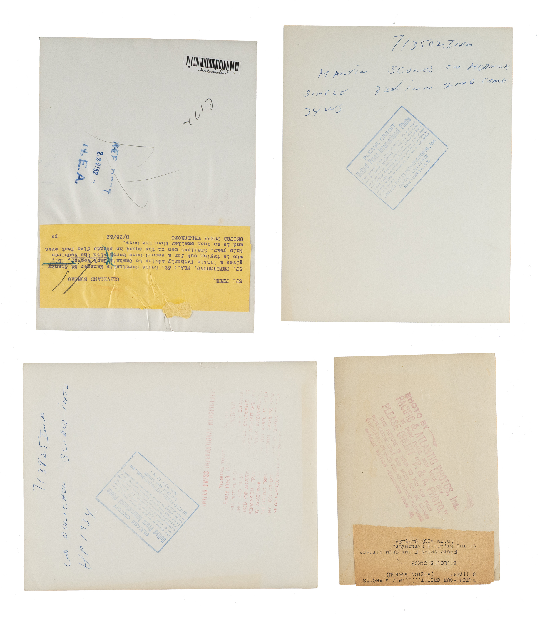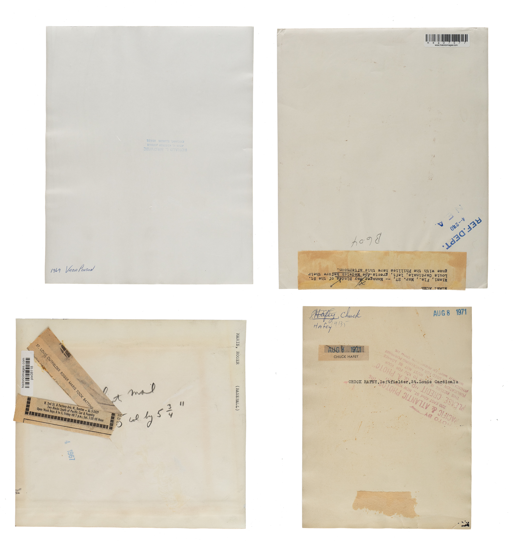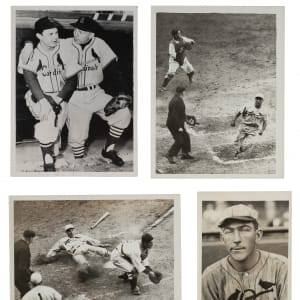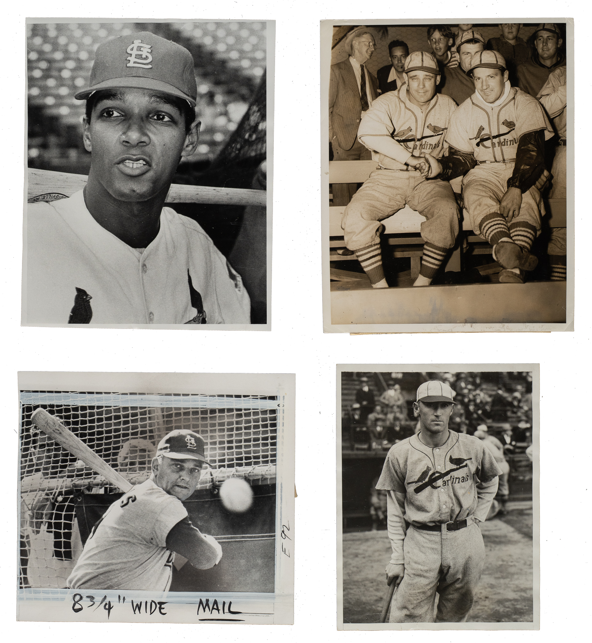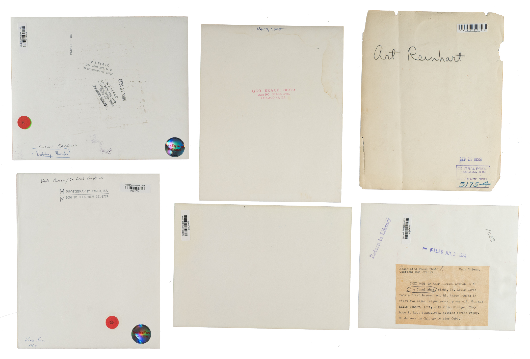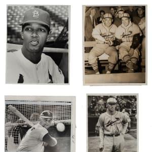 Collection of fourteen vintage news photos dating from the 1920s through the 1980s, each capturing one or more members of the St. Louis Cardinals. Sizes range from 5 x 7 inches to 8 x 10 inches, with eight of the photos having a "historicimages.com" sticker affixed to the reverse. All but one photo displays a news service credit stamp on the reverse. All the photos display flaws common to news photos, including (but not limited to), edge tears, pinholes, creases, and editorial markings/shadings on the front and/or reverse. Condition ranges from Poor to Very Good, averaging Good overall (with a few better). The players represented in this collection, with the number of photos for each player (if more than one) noted in parentheses, are as follows: Bobby Bonds, C. Davis (Geo. Brace photo stamped on back), Durocher, Hafey, Maris, P. Martin, two Pinson (Ronald L. Mrowiec stamped on back), Reinhart, and Rhem. Multi-player photos (4): Maris/Schoendienst, Medwick/Blades, Weaver/Stanky, and Cunningham/Stanky. Total: 14 photos. Please note that these photos have not been reviewed for type designations so no guarantees as to exact type classification can be made.