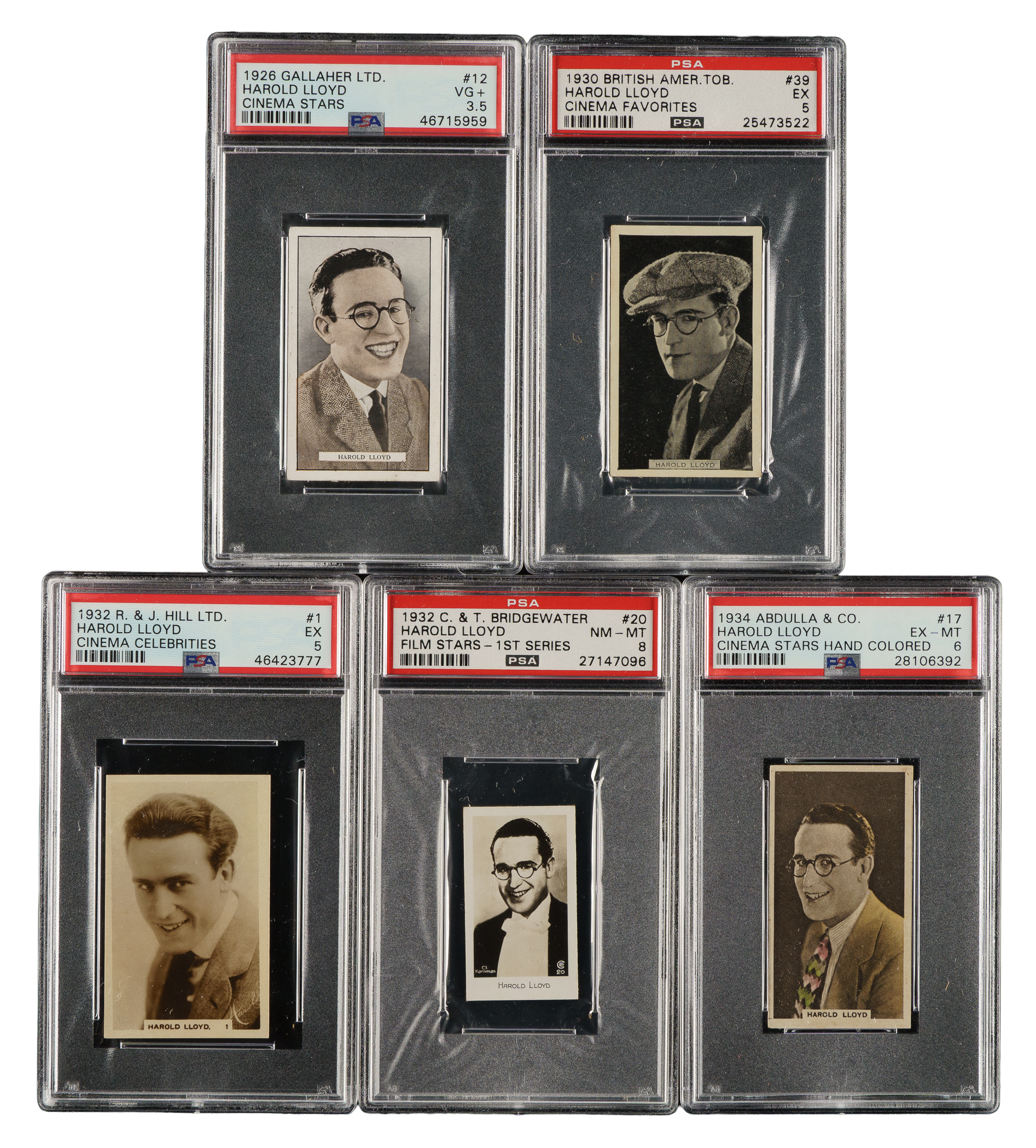 Collection of five 1926 to 1934 Gallaher Ltd., British American Tobacco, and Abdulla & Co. cards, each graded and encapsulated by PSA. This collection consists of the following: 1) 1926 Gallaher Ltd. "Cinema Stars" #12 Harold Lloyd (VG+ 3.5). 2) 1930 British American Tobacco "Cinema Favorites" #39 Harold Lloyd (EX 5). 3) 1932 R & J Hill Ltd. "Cinema Celebrities #1 Harold Lloyd (EX 5). 4) 1932 C & T Bridgewater "Film Stars" First Series #20 Harold Lloyd (NM-MT 8). 5) 1934 Abdulla & Co. "Cinema Stars" #17 Harold Lloyd (EX-MT 6). Total: 5 cards.