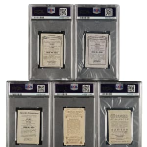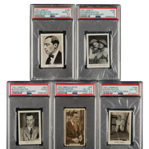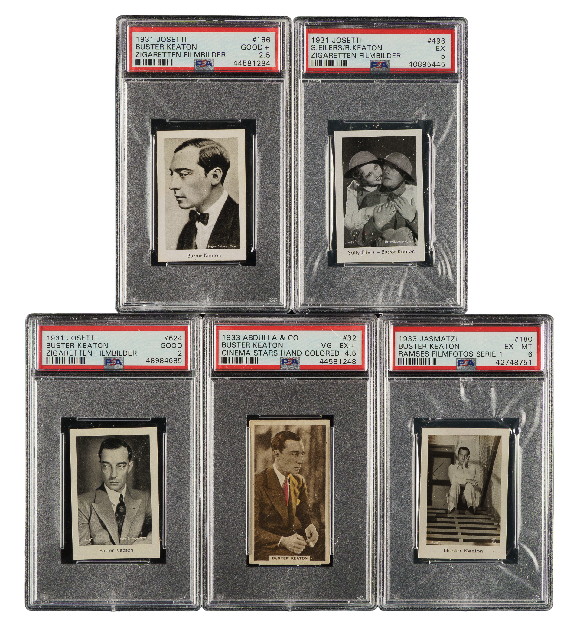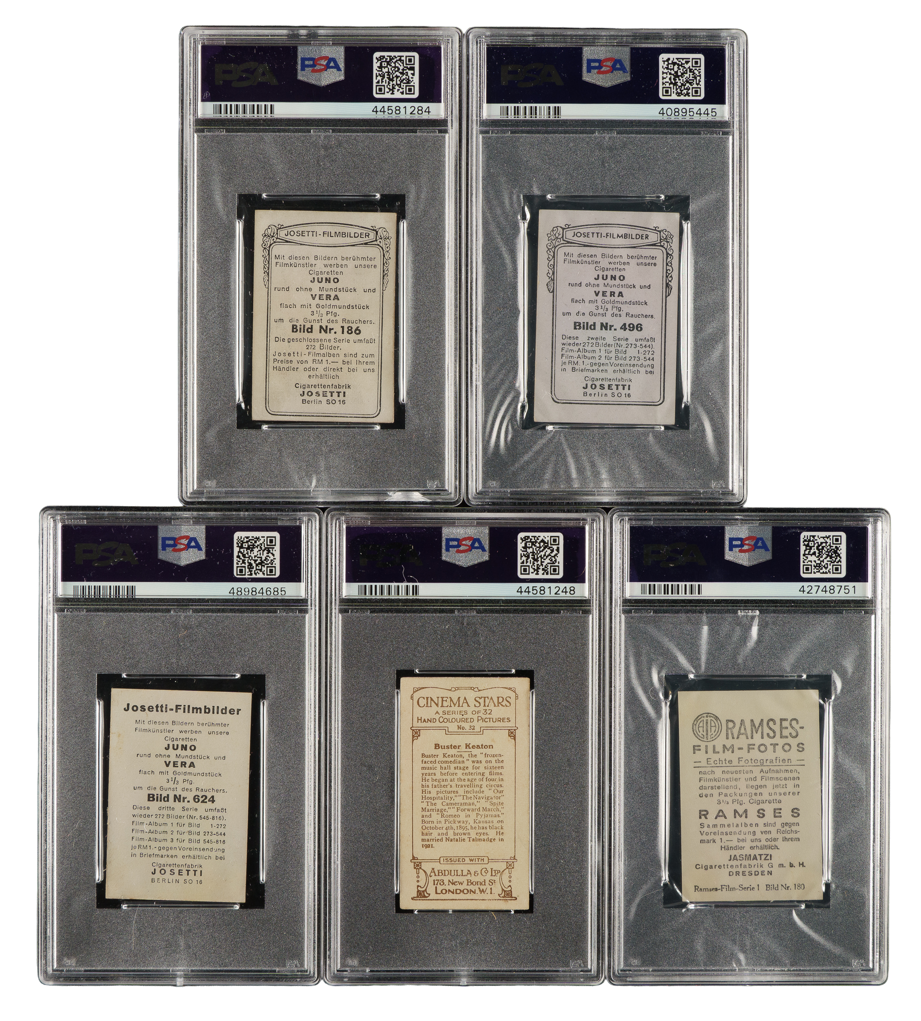 Collection of five 1931 to 1933 Josetti, Abdulla & Co., and Jasmatzi cards, each graded and encapsulated by PSA. This collection consists of the following: 1) 1931 Josetti Zigaretten Filmbilder (3 cards): #186 (GOOD+ 2.5), 496 (EX 5), and 624 (GOOD 2). 2) 1933 Abdulla & Co. "Cinema Stars" (1 card): #32 (VG-EX+ 4.5). 3) 1933 Jasmatzi Ramses Filmfotos First Series (1 card): #180 (EX-MT 6). Total: 3 cards.
