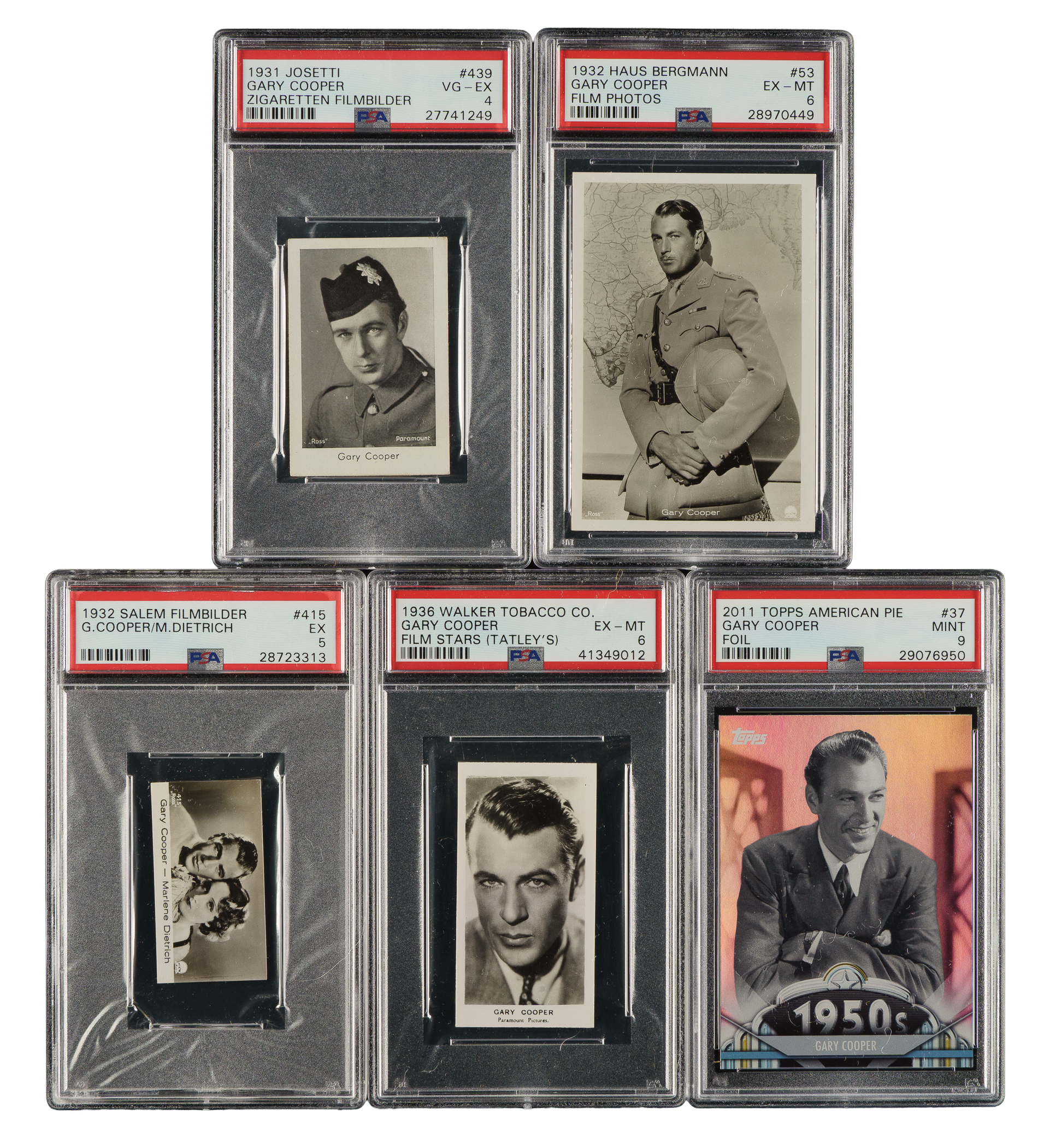 Collection of five 1931 to 2011 Josetti, Topps American Pie, and Salem Filmbilder cards, each graded and encapsulated by PSA. This collection consists of the following: 1) 1931 Josetti Zigaretten Filmbilder #439 Gary Cooper (VG-EX 4). 2) 1932 Haus Bergmann "Film Photos" #53 Gary Cooper (EX-MT 6). 3) 1932 Salem Filmbilder #415 Gary Cooper/Marlene Dietrich (EX 5). 4) 1936 Walker Tobacco Co. "Film Stars" Gary Cooper (EX-MT 6). 5) 2011 Topps American Pie #37 Gary Cooper Foil (MINT 9). Total: 5 cards.