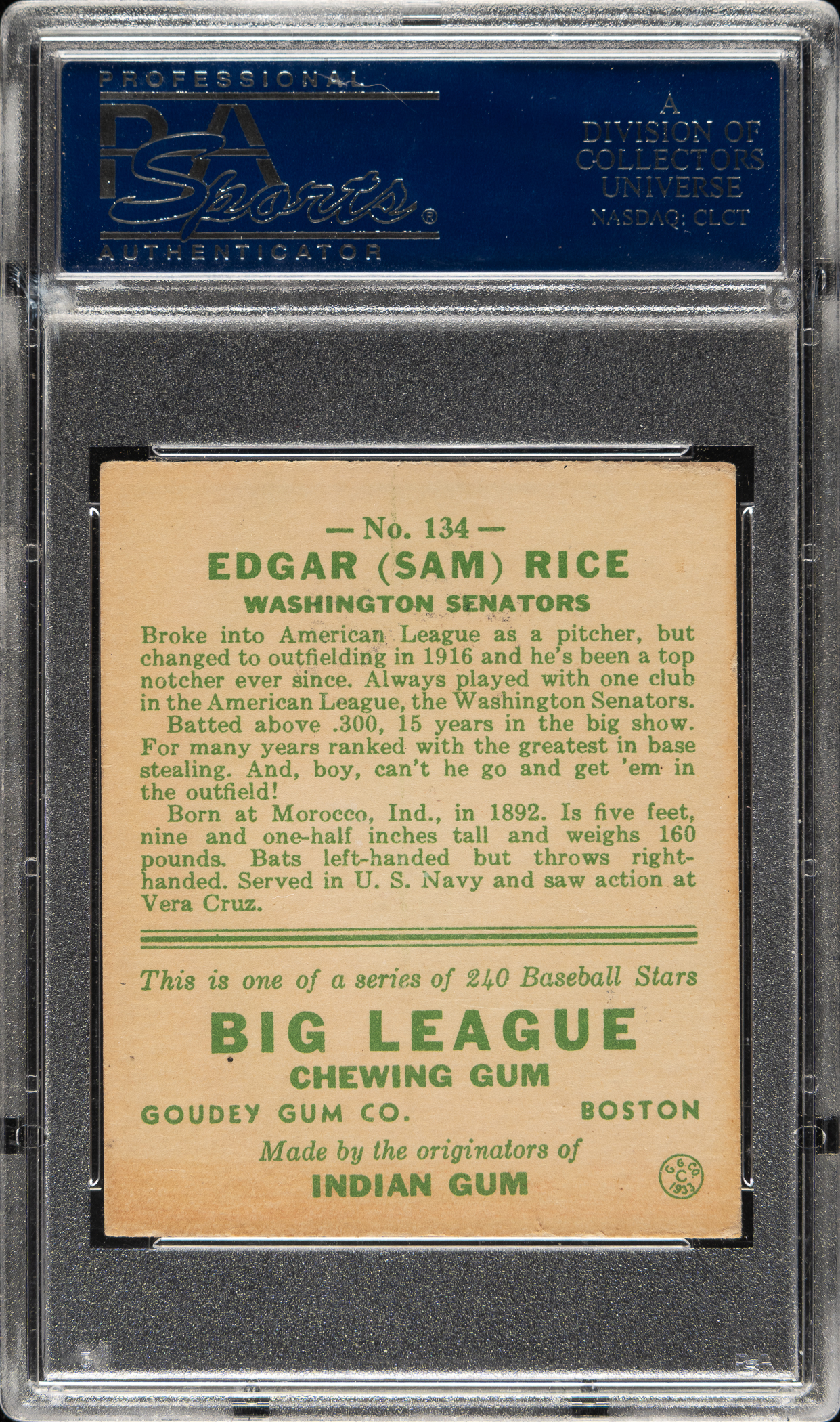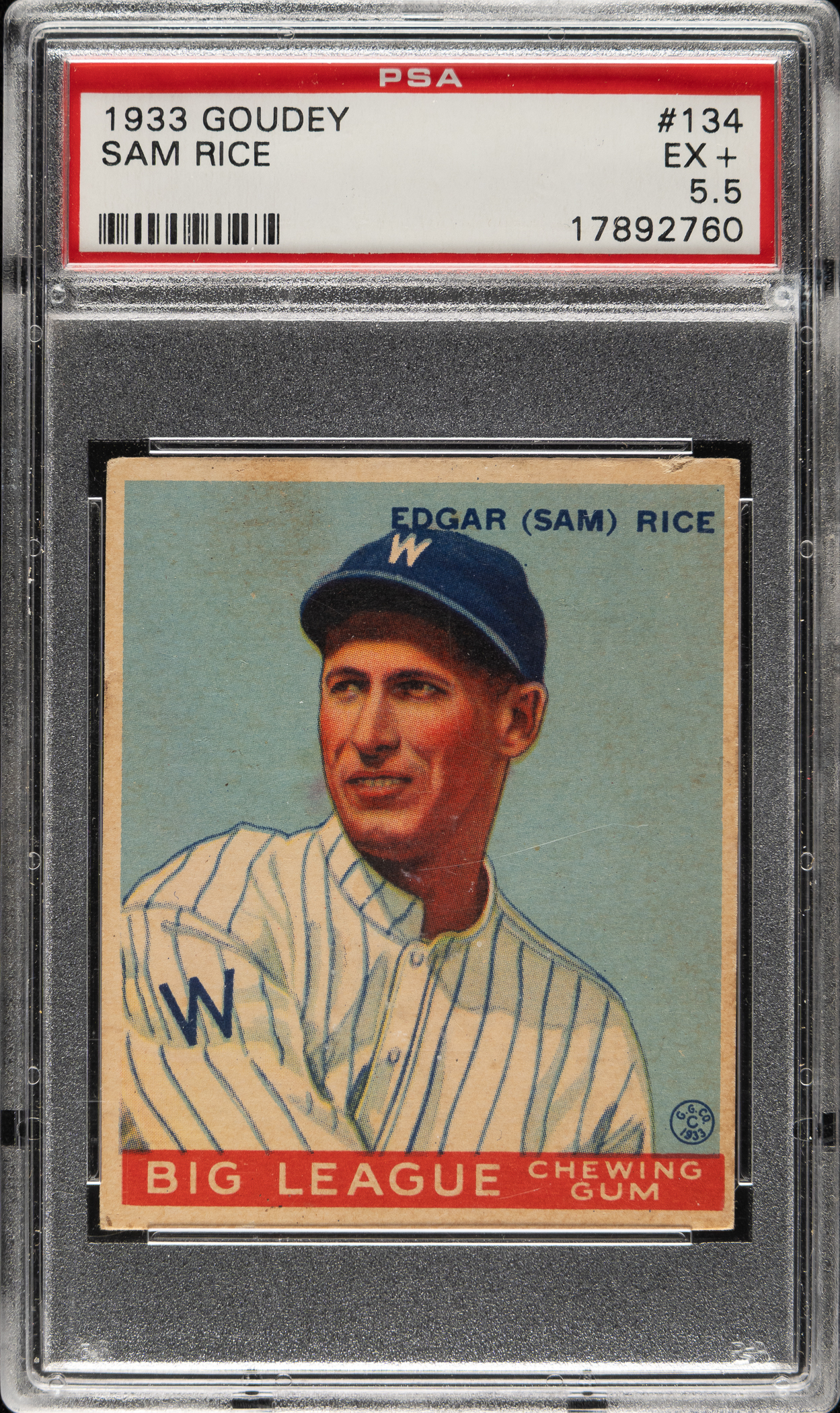 Graded EX+ 5.5 by PSA. Washington Senators Hall of Famer Sam Rice.