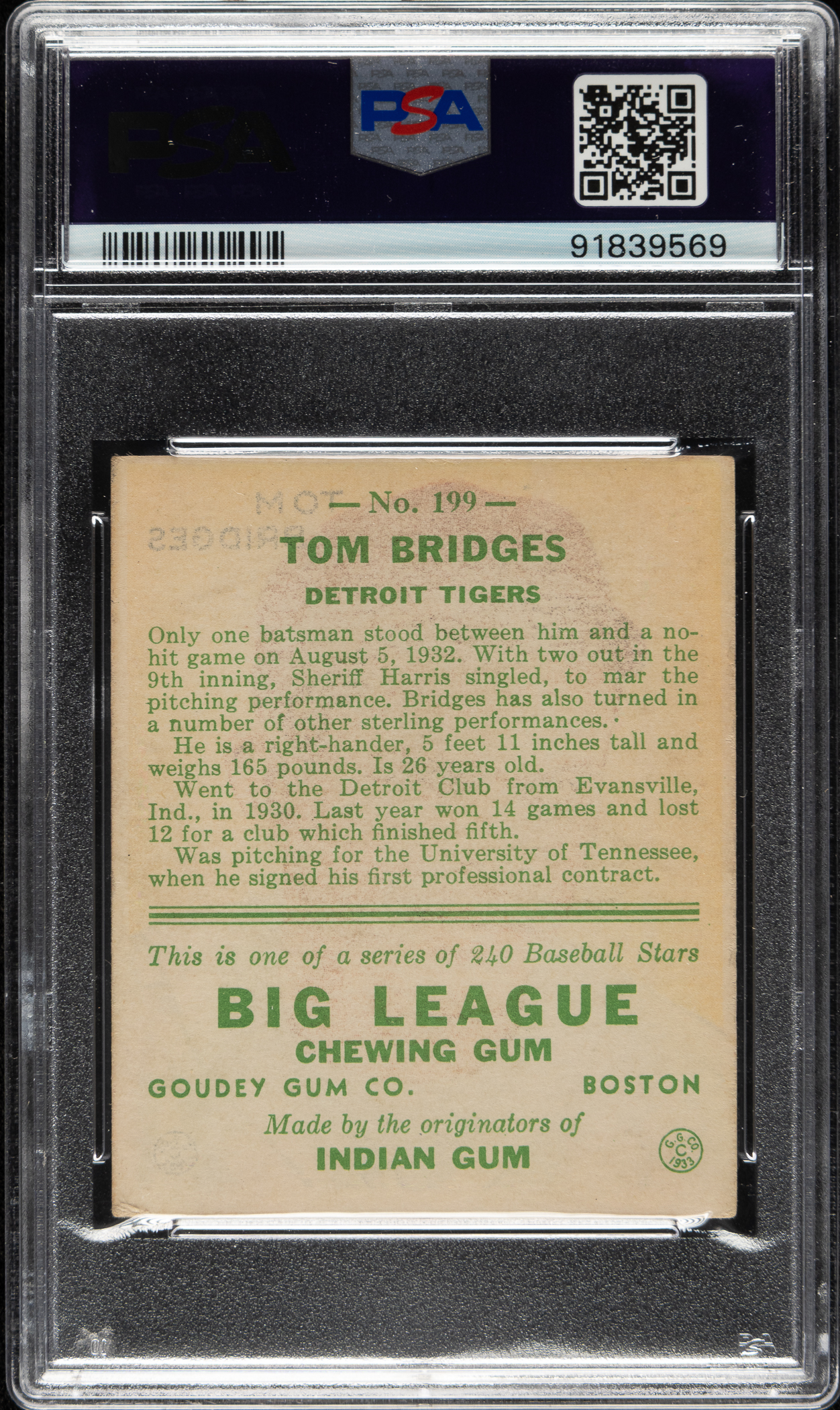 Lot # 1048: 1933 R319 Goudey #199 Tom Bridges PSA EX 5